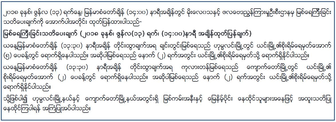 သို့ဖြစ်ပါ၍ ဟုမ္မလင်းမြို့နယ်နှင့် ကျောက်တော်မြို့နယ်အတွင်းရှိ မြစ်ကမ်းအနီးနှင့် မြေနိမ့်ပိုင်း နေထိုင်သူများအနေဖြင့် အထူးသတိပြု နေထိုင်ကြပါရန် အကြံပြုအပ်ပါသည်။