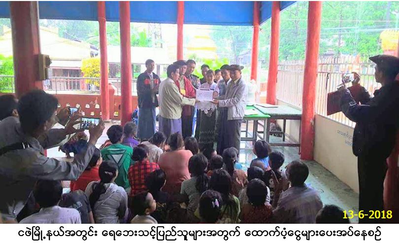 လူမှုဝန်ထမ်း၊ ကယ်ဆယ်ရေးနှင့် ပြန်လည်နေရာချထားရေးဝန်ကြီးဌာန၊ ဘေးအန္တရာယ်ဆိုင်ရာစီမံခန့်ခွဲမှုဦးစီးဌာန၊ မကွေးတိုင်းဒေသကြီးဦးစီး မှူးရုံးမှ တာဝန်ရှိသူများသည် မကွေးတိုင်းဒေသကြီး၊ ငဖဲမြို့နယ်တွင် (၁၁.၆.၂၀၁၈)ရက်နေ့၌ မိုးအဆက်မပြတ်ရွာသွန်း၍ ရေဝင် ရောက်မှုုကြောင့် ငဖဲမြို့နယ်၊ မြို့မရပ်ကွက်မှ ရေဘေးရှောင်ပြည်သူ(၁၃၉)ဦးတို့အတွက် ဆန်(၇)ရက်စာ(၂၉၁,၉၀၀/-) ကျပ်အား (၁၃.၆.၂၀၁၈)ရက်နေ့ (၁၃း၀၀)နာရီအချိန်တွင် ရေဘေးရှောင်ဓမ္မာရုံသို့ မင်းဘူးခရိုင်အုပ်ချုပ်ရေးမှူးတို့နှင့်အတူသွားရောက်၍ ထောက်ပံ့ပေး အပ်ခဲ့ကြောင်း သတင်းရရှိပါသည်။