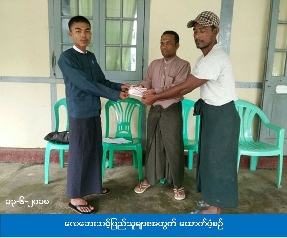 လူမှုဝန်ထမ်း၊ ကယ်ဆယ်ရေးနှင့် ပြန်လည်နေရာချထားရေးဝန်ကြီးဌာန၊ ဘေးအန္တရာယ်ဆိုင်ရာစီမံခန့်ခွဲမှုဦးစီးဌာန၊ ကျောက်ဖြူခရိုင်ဦးစီးမှူးရုံးမှ တာဝန်ရှိသူများသည် (၁၀-၆-၂၀၁၈) ရက်နေ့နှင့် (၁၂-၆-၂၀၁၈) ရက်နေ့တို့တွင် ဖြစ်ပွားခဲ့သော လေပြင်းဘေးကြောင့် ကျောက်ဖြူမြို့ ကျောက်တစ်လုံး IDP ကယ်ဆယ်ရေးစခန်းသို့ ရောက်ရှိနေသည့် ဘေးသင့်ပြည်သူ (၇၂) ဦးအတွက် (၇) ရက်စာဆန်ရိက္ခာဖိုး (၁၅၁၂၀၀ိ/-) အား (၁၃-၆-၂၀၁၈) ရက်နေ့တွင် ကျောက်ဖြူမြို့နယ်အထွေထွေအုပ်ချုပ်ရေးဦးစီးဌာန၌ အဆိုပါကယ်ဆယ်ရေးစခန်းမှ ဥက္ကဌထံ လွှဲပြောင်း ထောက်ပံ့ပေးခဲ့ကြောင်း သိရှိရပါသည်။
