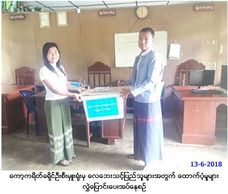 လူမှုဝန်ထမ်း၊ ကယ်ဆယ်ရေးနှင့် ပြန်လည်နေရာချထားရေးဝန်ကြီးဌာန၊ ဘေးအန္တရာယ်ဆိုင်ရာစီမံခန့်ခွဲမှုဦးစီးဌာန၊ ကော့ကရိတ်ခရိုင်ဦးစီးမှူး ရုံးမှ တာဝန်ရှိသူများသည် ကရင်ပြည်နယ်၊ ကော့ကရိတ်ခရိုင်၊ ကော့ကရိတ်မြို့နယ် ကျုံဒိုးချောင်းဖျားကျေးရွာအုပ်စု အုန်းတပင်ကျေးရွာ၌ (၁၀.၆.၂၀၁၈)ရက်နေ့တွင် လေပြင်းတိုက်ခတ်မှုကြောင့် တစိတ်တပိုင်းပျက်စီး အိမ်ခြေ(၁)လုံးနှင့် အိမ်ထောင်စု(၁)စုမှ လူဦးရေ(၆)ဦးအတွက် အိမ်ဆောက်ပစ္စည်းဖိုး(၁၀၀၀၀၀ိ/-)ကျပ်နှင့် အိမ်ထောင်စု(၁)စုစာအတွက် ကယ်ဆယ်ရေးပစ္စည်း(၁၁)မျိုးအား (၁၃.၆.၂၀၁၈)ရက်နေ့တွင် ကော့ကရိတ်မြို့နယ် အထွေထွေအုပ်ချုပ်ရေးဦးစီးဌာနရုံး၌ သွားရောက်ထောက်ပံ့ပေးအပ်ခဲ့ကြောင်း သတင်းရရှိပါသည်။