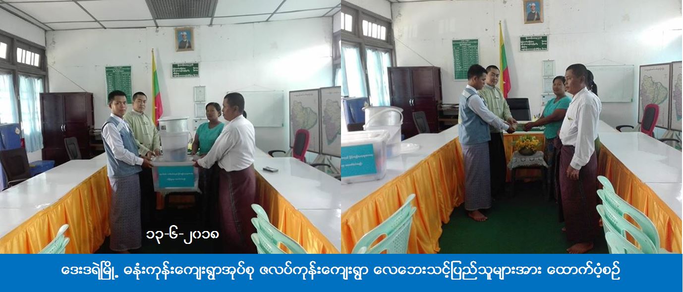 လူမှုဝန်ထမ်း၊ ကယ်ဆယ်ရေးနှင့် ပြန်လည်နေရာချထားရေးဝန်ကြီးဌာန၊ ဘေးအန္တရာယ်ဆိုင်ရာစီမံခန့်ခွဲမှုဦးစီးဌာန၊ ဖျာပုံခရိုင်ဦးစီးမှူးရုံးမှ တာဝန်ရှိသူများသည် ဒေးဒရဲမြို့ ဓနုံးကုန်းကျေးရွာအုပ်စု ဇလပ်ကုန်းကျေးရွာ၌ (၁၂-၆-၂၀၁၈) ရက်နေ့တွင် မိုးသက်လေပြင်းကျရောက်မှုကြောင့် ပြိုကျပျက်စီးခဲ့သည့် လူနေအိမ် (၁) လုံး အိမ်ထောင်စု (၁) စုမှ လူဦးရေး (၂) ဦးအတွက် ဆန်ရိက္ခာဖိုးငွေ (၄၂၀၀ိ/-)၊ အိမ်ဆောက်ပစ္စည်းဖိုးငွေ (၁) သိန်းကျပ်နှင့် ကယ်ဆယ်ရေးပစ္စည်း (၁၆) မျိုး (၁) အိမ်ထောင်စာအား သက်ဆိုင်ရာတာဝန်ရှိသူများ ရှေ့မှောက်တွင် ဘေးသင့်ပြည်သူများထံ ထောက်ပံ့ပေးအပ်ခဲ့ကြောင်း သိရှိရပါသည်။