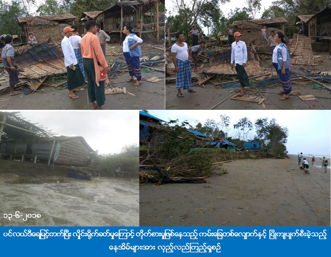 လူမှုဝန်ထမ်း၊ ကယ်ဆယ်ရေးနှင့် ပြန်လည်နေရာချထားရေးဝန်ကြီးဌာန၊ ဘေးအန္တရာယ်ဆိုင်ရာစီမံခန့်ခွဲမှုဦးစီးဌာန၊ ဖျာပုံခရိုင်ဦးစီးမှူးရုံးမှ တာဝန်ရှိသူများသည် ဖျာပုံမြို့နယ်၊ အမာမြို့၊ ဒေါ်ငြိမ်းကျေးရွာအုပ်စု၊ သရက်ပင်ဆိပ်၊ အောင်လှိုင်၊ ပက်ပြဲအေးကုန်းကျေးရွာများ၌ (၁၂-၆-၂၀၁၈) ရက်နေ့တွင် ပင်လယ်ဒီရေမြင့်တက်ပြီး လှိုင်းရိုက်ခတ်မှုကြောင့် နေအိမ် (၁၂) လုံးပြိုကျပျက်စီးခဲ့မှုအတွက် ကယ်ဆယ်ရေးပစ္စည်း (၁၆) မျိုး (၁၂) အိမ်ထောင်စာ၊ အိမ်ဆောက်ပစ္စည်းဖိုးငွေ (၁၂) သိန်းနှင့် ဆန်ဖိုးငွေ (၁၁၃၄၀၀) ကျပ်တို့ကို (၁၃-၆-၂၀၁၈) ရက်နေ့တွင် ပြည်သူ့လွှတ်တော်ကိုယ်စားလှယ်နှင့်အတူ သွားရောက်ထောက်ပံ့ခဲ့ပါသည်။ ဆက်လက်ပြီး ပင်လယ်ဒီရေမြင့်တက်ပြီး လှိုင်းကြီးများ ရိုက်ခတ်မှုကြောင့် ကမ်းခြေတိုက်စားမှုှုဖြစ်နေသည့် သရက်ပင်ဆိပ်၊ ခါးပြတ်၊ ဗန်ဒါပင်၊ အောင်လှိုင်၊ ပက်ပြဲအေးကုန်းကျေးရွာ ကမ်းစပ်တစ်လျှောက် လှည့်လည်ကြည့်ရှုခဲ့ပြီး သက်ဆိုင်ရာတာဝန်ရှိသူများမှလည်း ထိခိုက်ဆုံရှုံးမှုမရှိစေရေး ကျေးရွာသဘာဝဘေးကာကွယ်ရေးကော်မတီအဖွဲ့များနှင့်အမြဲမပြတ်စောင့်ကြပ် ကြည့်ရှူနေကြကြောင်း သိရှိရပါသည်။