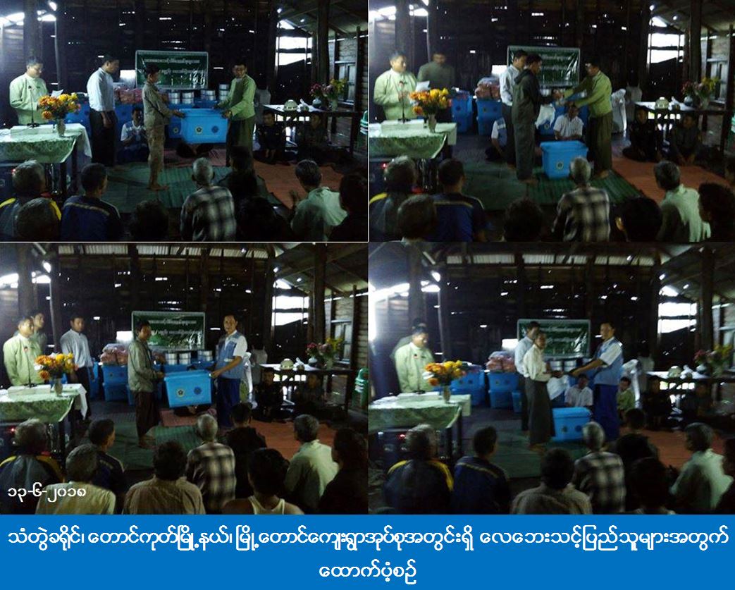 လူမှုဝန်ထမ်း၊ ကယ်ဆယ်ရေးနှင့် ပြန်လည်နေရာချထားရေးဝန်ကြီးဌာန၊ ဘေးအန္တရာယ်ဆိုင်ရာစီမံခန့်ခွဲမှုဦးစီးဌာန၊ ပြည်ခရိုင်ဦးစီးမှူးရုံးမှ တာဝန်ရှိသူများသည် ရခိုင်ပြည်နယ်၊ သံတွဲခရိုင်၊ တောင်ကုတ်မြို့နယ်၊ မြို့တောင်ကျေးရွာအုပ်စု၌ (၁၁-၆-၂၀၁၈) ရက်နေ့တွင် ဖြစ်ပွားခဲ့သော လေဘေးသင့်ပြိုလဲအိမ်ခြေ (၄) လုံးအတွက် အိမ်ဆောက်ပစ္စည်းဖိုး (၄၀၀၀၀၀ိ/-)၊ လူ(၁၄၉)ဦးအတွက် ဆန်ရိက္ခာဖိုး(၃၁၂၉၀၀ိ/-)နှင့် ကယ်ဆယ်ရေးပစ္စည်း (၁၅) မျိုး ပလပ်စတစ်ပုံးအပါ (၄) အိမ်ထောင်စာ၊ တစ်စိတ်တစ်ပိုင်းပျက်စီးအိမ် (၃၀) လုံးအတွက် တန်ဖိုးသင့့်နှုန်းဖြင့် အိမ်ဆောက်ပစ္စည်းဖိုး (၂၃၉၀၀၀၀ိ/-)နှင့် ကယ်ဆယ်ရေးပစ္စည်း (၁၀) မျိုး ပလပ်စတစ်ပုံးအပါ (၃၀) အိမ်ထောင်စာ၊ တစ်စိတ်တစ်ပိုင်းပျက်စီးဘုန်းကြီးကျောင်း (၁) ကျောင်းအတွက် ကျောင်းဆောက်ပစ္စည်းဖိုး(၁၀၀၀၀၀ိ/-)၊ စုစုပေါင်းရန်ပုံငွေ (၃၃၀၂၉၀၀ိ/-) အား (၁၃-၆-၂၀၁၈) ရက်နေ့တွင် ပြည်သူလက်ဝယ်အရောက် ကွင်းဆင်းထောက်ပံ့ပေးခဲ့ပါသည်။ ထောက်ပံ့ပေးအပ်ပွဲသို့ တောင်ကုတ်မြို့နယ်ပြည်နယ်လွှတ်တော်ကိုယ်စား၊ တောင်ကုတ်မြို့နယ်အုပ်ချုပ်ရေးမှူး၊ မြို့တောင်/ရွာမမီးသတ်စခန်းမှူးနှင့် တာဝန်ရှိသူများ၊ ရပ်မိရပ်ဖများ၊ ဘေးသင့်ပြည်သူစုစုပေါင်း (၁၀၀) ဦးခန့် တက်ရောက်ခဲ့ကြောင်း သိရှိရပါသည်။
