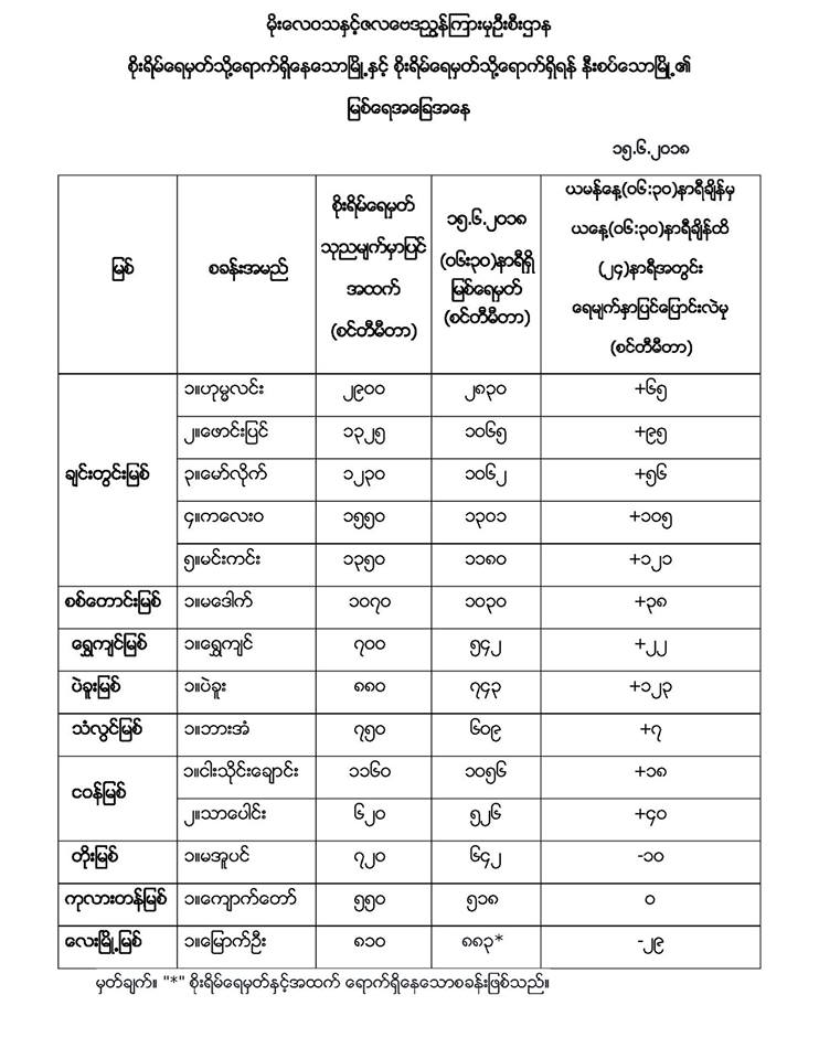 မိုးလေဝသနှင့်ဇလဗေဒညွန်ကြားမှုဦးစီးဌာနမှ (၁၅.၆.၂၀၁၈) ရက်နေ့ နံနက် (၀၆:၃၀) နာရီ အချိန်တွင် တိုင်းတာရရှိသော စိုးရိမ်ရေမှတ်သို့ ရောက်ရှိနေသောမြို့နှင့်စိုးရိမ်ရေမှတ်သို့ရောက်ရှိရန် နီးစပ်သောမြို့၏ မြစ်ရေအခြေအနေကို သိရှိနိုင်ပါရန် ဖော်ပြလိုက်ပါသည်။