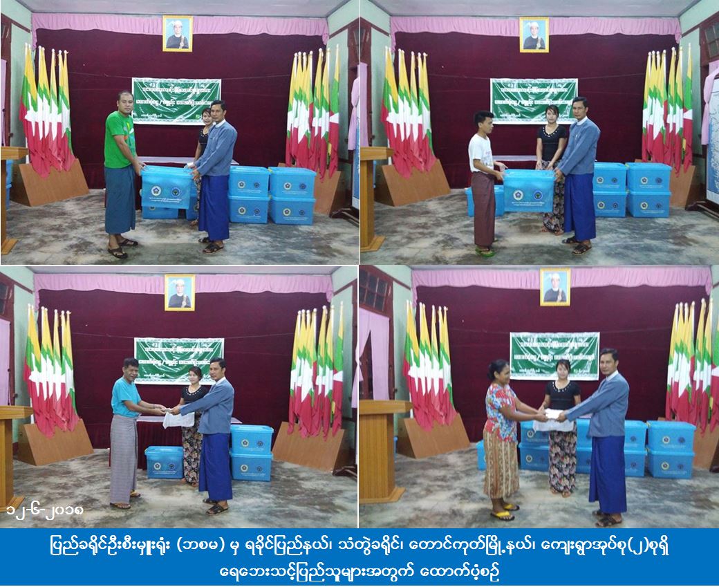 လူမှုဝန်ထမ်း၊ ကယ်ဆယ်ရေးနှင့် ပြန်လည်နေရာချထားရေးဝန်ကြီးဌာန၊ ဘေးအန္တရာယ်ဆိုင်ရာစီမံခန့်ခွဲမှုဦးစီးဌာန၊ ပြည်ခရိုင်ဦးစီးမှူးရုံးမှ တာဝန်ရှိသူများသည် ရခိုင်ပြည်နယ်၊ သံတွဲခရိုင်၊ တောင်ကုတ်မြို့နယ်၊ ကျေးရွာအုပ်စု(၂)စု၌ (၁၂-၆-၂၀၁၈) ရက်နေ့တွင် ဖြစ်ပွားခဲ့သော ရေဘေးကြောင့် မျှောပါပျက်စီးခဲ့သည့်အိမ်ခြေ(၄)လုံးအတွက် အိမ်ဆောက်ပစ္စည်းဖိုး(၄၀၀၀၀၀ိ/-)၊ လူ(၂၁)ဦးအတွက် ဆန်ရိက္ခာဖိုး(၄၄၁၀၀ိ/-) နှင့် ထောက်ပံ့ရေးပစ္စည်း(၁၅)မျိုးပလပ်စတစ်ပုံးအပါ(၄)အိမ်ထောင်စာ၊ စုစုပေါင်းရန်ပုံငွေ(၄၄၄၁၀၀ိ/-)အား (၁၂-၆-၂၀၁၈) ရက်နေ့တွင် ပြည်သူများလက်ဝယ်အရောက် ထောက်ပံ့ပေးခဲ့ကြောင်း သိရှိရပါသည်။