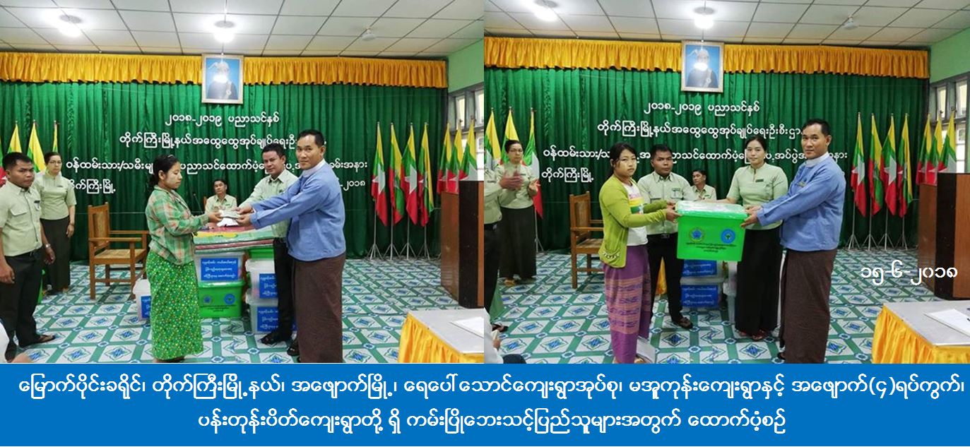 လူမှုဝန်ထမ်း၊ ကယ်ဆယ်ရေးနှင့် ပြန်လည်နေရာချထားရေးဝန်ကြီးဌာန၊ ဘေးအန္တရာယ်ဆိုင်ရာစီမံခန့်ခွဲမှုဦးစီးဌာန၊ ရန်ကုန်တိုင်းဒေသကြီးဦးစီးမှူးရုံးမှ တာဝန်ရှိသူများသည် မြောက်ပိုင်းခရိုင်၊ တိုက်ကြီးမြို့နယ်၊ အဖျောက်မြို့၊ ရေပေါ်သောင်ကျေးရွာအုပ်စု၊ မအူကုန်းကျေးရွာနှင့် အဖျောက်(၄)ရပ်ကွက်၊ ပန်းတုန်းပိတ်ကျေးရွာတို့၌ (၁၄-၆-၂၀၁၈) ရက်နေ့တွင် ဧရာဝတီမြစ်ရေတိုက်စား၍ ကမ်းပါးပြိုကျမှုအန္တရာယ်ကြောင့် အိမ်ထောင်စု(၄)စုမှ လူဦးရေ(၁၈)ဦးဘေးသင့်ခဲ့သည့်အတွက် ဆန်ရိက္ခာဖိုးငွေ (၃၇,၈၀၀ိ/-)၊အိမ်ဆောက်ပစ္စည်းဖိုးထောက်ပံ့ငွေ (၄၀၀,၀၀၀ိ/-)၊ စုစုပေါင်းထောက်ပံ့ငွေ(၄၃၇,၈၀၀ိ/-)နှင့် ကယ်ဆယ်ရေးပစ္စည်း (၁၁)မျိုး (၄) အိမ်ထောင်စာတို့အား (၁၅-၆-၂၀၁၈) ရက်နေ့၊ နံနက်ပိုင်းတွင် သက်ဆိုင်ရာမြို့နယ်အုပ်ချုပ်ရေးအဖွဲ့များနှင့်အတူ ဘေးသင့်ပြည်သူများလက်ဝယ်သို့ သွားရောက်ထောက်ပံ့ပေးအပ်ခဲ့ကြောင်း သိရှိရပါသည်။