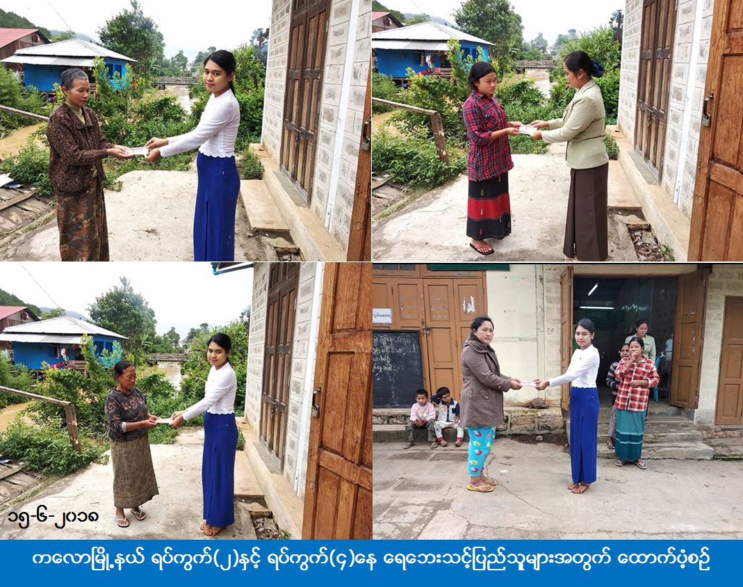 လူမှုဝန်ထမ်း၊ ကယ်ဆယ်ရေးနှင့် ပြန်လည်နေရာချထားရေးဝန်ကြီးဌာန၊ ဘေးအန္တရာယ်ဆိုင်ရာစီမံခန့်ခွဲမှုဦးစီးဌာန၊ ရှမ်းပြည်နယ်ဦးစီးမှူးရုံးမှ တာဝန်ရှိသူများသည် ကလောမြို့နယ် ရပ်ကွက်(၂)နှင့် ရပ်ကွက်(၄)၌ (၁၄-၆-၂၀၁၈) ရက်နေ့တွင် မိုးသည်းထန်စွာရွာသွန်းပြီး ကလောချောင်းရေလျှံတက်မှုကြောင့် နေအိမ်များအတွင်း ရေများဝင်ရောက်ခဲ့ရာ ရေဘေးသင့်အိမ်ထောင်စု (၆၅) စုရှိ လူဦးရေ (၂၈၄) ဦးအတွက် ဆန်ရိက္ခာ (၇)ရက်စာ (၅၉၆၄၀၀ိ/-)ကျပ်အား ပြည်သူများ လက်ဝယ်အရောက်ထောက်ပံ့ပေးခဲ့ကြောင်း သိရှိရပါသည်။