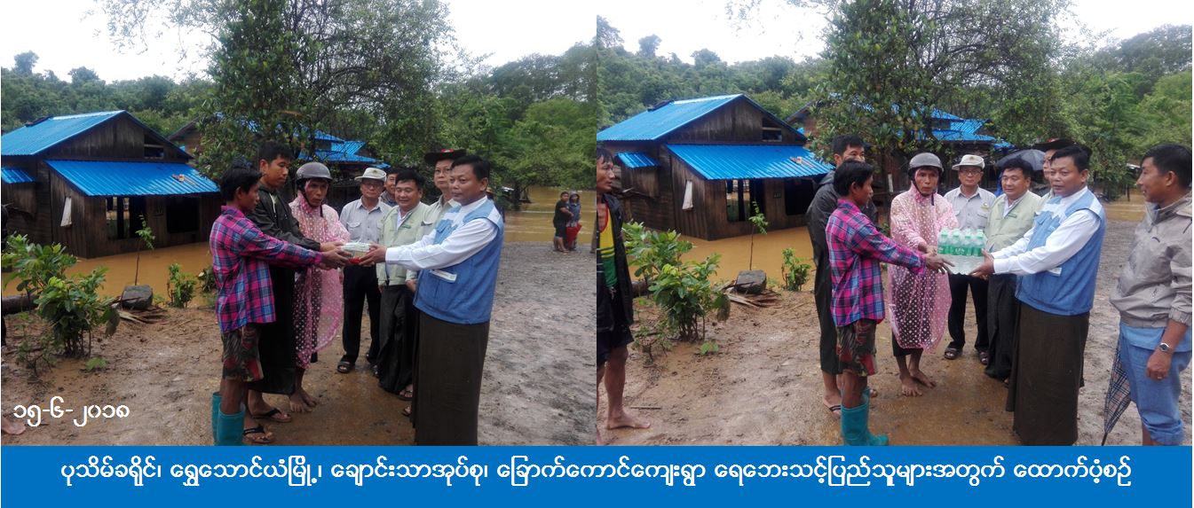 လူမှုဝန်ထမ်း၊ ကယ်ဆယ်ရေးနှင့် ပြန်လည်နေရာချထားရေးဝန်ကြီးဌာန၊ ဘေးအန္တရာယ်ဆိုင်ရာစီမံခန့်ခွဲမှုဦးစီးဌာန၊ ဧရာဝတီတိုင်းဒေသကြီးဦးစီးမှူးရုံးမှ ညွှန်ကြားရေးမှူး၊ ဦးသန်းစိုးနှင့် တာဝန်ရှိသူများသည် ပုသိမ်ခရိုင်၊ ရွှေသောင်ယံမြို့၊ ချောင်းသာအုပ်စု၊ ခြောက်ကောင်ကျေးရွာ၌ (၁၅-၆-၂၀၁၈) ရက်နေ့တွင် မိုးသည်းထန်စွာရွာသွန်းပြီး တောင်ကျရေများ ဝင်ရောက်ခဲ့သော အိမ်ထောင်စု (၉၈) စုမှ လူဦးရေ (၄၄၀)ဦးအတွက် ဆန်ရိက္ခာ(၇)ရက်စာရန်ပုံငွေ (၉၂၄၀၀၀ိ/-) အား (၁၅-၆-၂၀၁၈) ရက်နေ့ (၁၆း၀၀) နာရီအချိန်တွင် ပုသိမ်ခရိုင်အထွေထွေအုပ်ချုပ်ရေးမှူး၊ ပုသိမ်မြို့နယ်အထွေထွေအုပ်ချုပ်ရေးမှူးနှင့် သက်ဆိုင်ရာတာဝန်ရှိသူများနှင့်အတူ ရေဘေးသင့်ပြည်သူများထံသို့ လက်ဝယ်အရောက် ကွင်းဆင်းထောက်ပံ့ခဲ့ပါကြောင်းနှင့် ကျန်ရှိသော ရေဘေးသင့် ကျေးရွာများမှ ဘေးသင့်ပြည်သူများအား ဆက်လက်ထောက်ပံ့သွားမည်ဖြစ်ကြောင်း သိရှိရပါသည်။