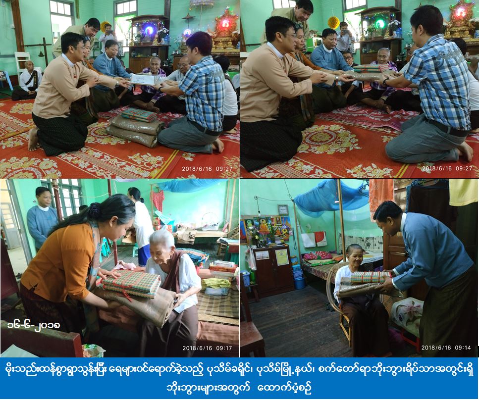 လူမှုဝန်ထမ်း၊ ကယ်ဆယ်ရေးနှင့် ပြန်လည်နေရာချထားရေးဝန်ကြီးဌာန၊ ဘေးအန္တရာယ်ဆိုင်ရာစီမံခန့်ခွဲမှုဦးစီးဌာန၊ ဧရာဝတီတိုင်းဒေသကြီးဦးစီးမှူးရုံးမှ ညွှန်ကြားရေးမှူး၊ ဦးသန်းစိုးနှင့် တာဝန်ရှိသူများသည် ပုသိမ်ခရိုင်၊ ပုသိမ်မြို့နယ်၊ စက်တော်ရာဘိုးဘွားရိပ်သာ၌ (၁၅-၆-၂၀၁၈) ရက်နေ့တွင် မိုးသည်းထန်စွာရွာသွန်းပြီး ရေများဝင်ရောက်ခဲ့သဖြင့် အဘိုး(၁၄)ဦး၊ အဘွား(၂၄)ဦး၊ စုစုပေါင်း(၃၈)ဦးတို့အား JICA စောင်(၃၈)ထည်၊ ပိုက်ဖျာ(၃၈)ချပ်နှင့် ဆန်ရိက္ခာ၇ရက်စာရန်ပုံငွေ(၇၉၈၀၀ိ/-)အား (၁၆-၆-၂၀၁၈) ရက်နေ့၊ (၀၉း၀၀)နာရီတွင် တိုင်းဒေသကြီးအစိုးရအဖွဲ့ ၊ လူမှုရေးဝန်ကြီး၊ တိုင်းဒေသကြီးလွှတ်တော်ကိုယ်စားလှယ် ဦးအောင်သူထွေး၊ လူမှုဝန်ထမ်းဦးစီးဌာန၊ တိုင်းဒေသကြီးဦးစီးမှူး ဦးတင်ဇော်မိုးတို့နှင့်အတူ လှူဒါန်းထောက်ပံ့ခဲ့ကြောင်း သိရှိရပါသည်။