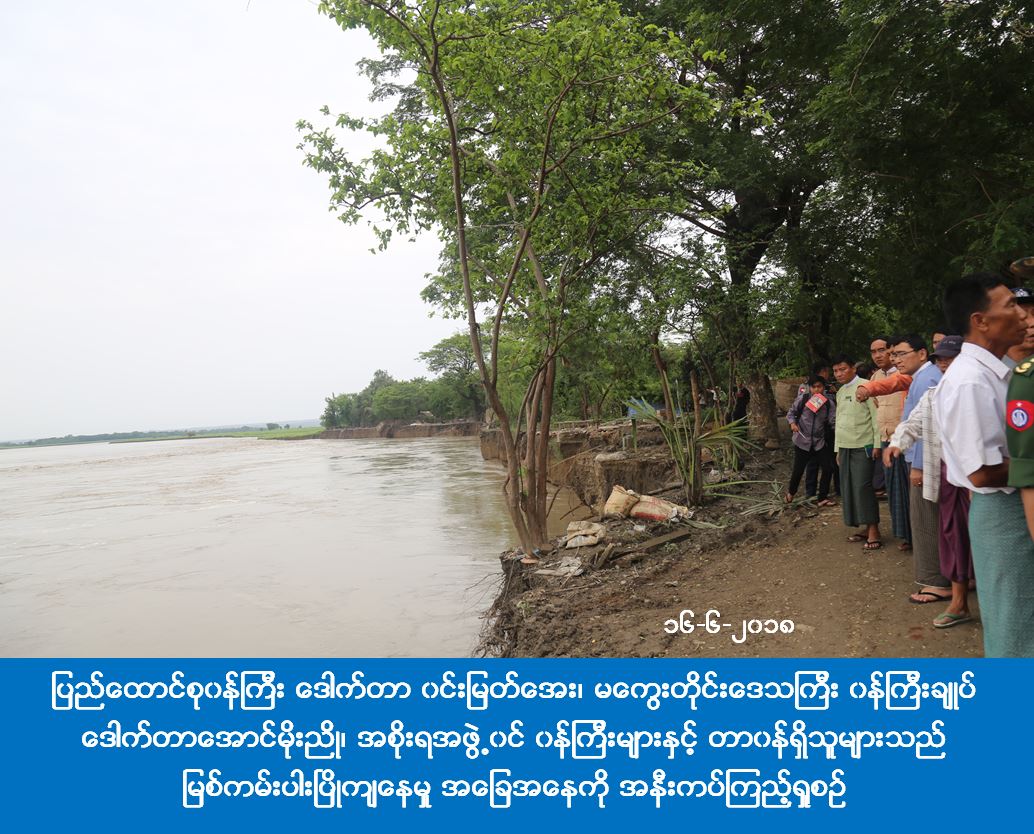 ထိုနောက် မကွေးတိုင်းဝန်ကြီးချုပ် ဒေါက်တာအောင်မိုးညိုက ဇွန်လ ဒုတိယပတ်အတွင်း မိုးသည်းထန်စွာ ရွာသွန်းမှုကြောင့် အဓိကဆည်ကြီး (၆)ခုတွင် ကန်ရေပြည့်အမှတ်များ ကျော်လွန်ပြီး မုန်းချောင်း၊ မန်းချောင်း၊မင်းတုန်းချောင်း၊ မဒေးချောင်းများ ရေကြီးမှုဖြစ်ပွားကာ မင်းဘူးနှင့် သရက်ခရိုင်အတွင်း ရှိကျေးရွာအချို့ရေကြီးနစ်မြုပ်ခဲ့ရကြောင်း၊ လမ်းများ၊ တံတားများ၊ လယ်ယာမြေများနှင့် စိုက်ပျိုးထားသော သီးနှံများပျက်စီးဆုံးရှုံးခဲ့ရသည့်အပြင် လူ(၅)ဦး အသက်ဆုံးရှုံးခဲ့ရကြောင်းနှင့် တိုင်းဒေသကြီးအစိုးရအနေဖြင့် အမျိုးသားသဘာဝဘေးအန္တရာယ် ဆိုင်ရာစီမံခန့်ခွဲမှုကော်မတီသို့ ဆက်လက်တင်ပြ ဆောင်ရွက်မည်ဖြစ်ကြောင်း ပြောကြား ခဲ့ပါသည်။