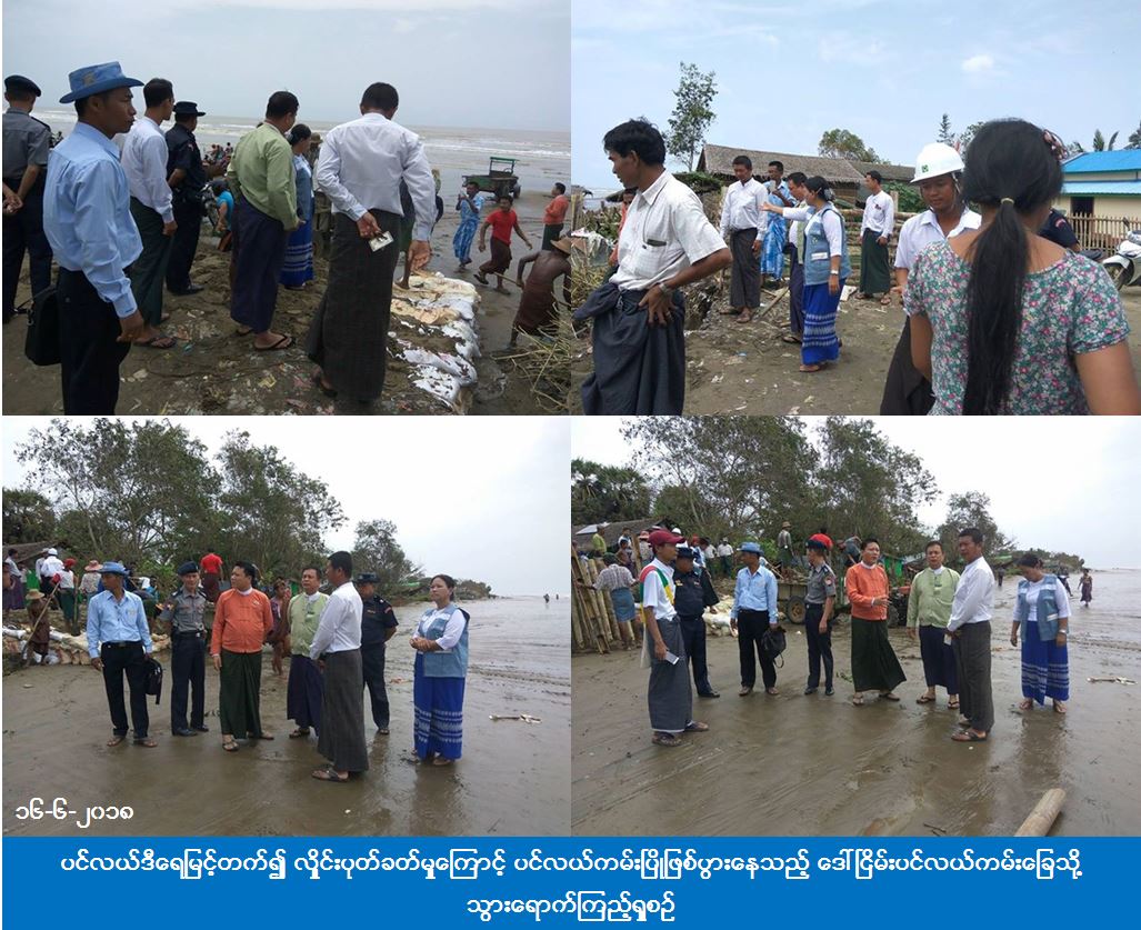လူမှုဝန်ထမ်း၊ ကယ်ဆယ်ရေးနှင့် ပြန်လည်နေရာချထားရေးဝန်ကြီးဌာန၊ ဘေးအန္တရာယ်ဆိုင်ရာစီမံခန့်ခွဲမှုဦးစီးဌာန၊ ဖျာပုံခရိုင်ဦးစီးမှူးရုံးမှ တာဝန်ရှိသူများသည် ဒေါ်ငြိမ်းပင်လယ်ကမ်းခြေ၌ (၁၂-၆-၂၀၁၈) ရက်နေ့မှစတင်ကာ ပင််လယ်ဒီရေမြင့်တက်၍ လှိုင်းပုတ်ခတ်မှုကြောင့် ပင်လယ်ကမ်းပြိုဖြစ်ပွားနေသည့် အဆိုပါကမ်းခြေသို့ (၁၆-၆-၂၀၁၈) ရက်နေ့တွင် ဧရာဝတီတိုင်းဒေသကြီး လွှတ်တော်ကိုယ်စားလှယ်ဦးဘိုဘိုမင်းဇော်၊ ဖျာပုံခရိုင်အထွေထွေအုပ်ချုပ်ရေးဦးစီးဌာနမှ ခရိုင်အုပ်ချုပ်ရေးမှူး ဦးအေးလွင်၊ ဖျာပုံခရိုင်သဘာဝဘေးကာကွယ်စောင့်ရှောက်ရေးကော်မတီအဖွဲ့ဝင်များနှင့်အတူ သွားရောက်ကြည့်ရှူ၍ ဒေသခံများနှင့်တွေ့ဆုံခဲ့ပြီး လိုအပ်သည်များ ညှိနှိုင်းဆွေနွေးခဲ့ကြပြီး ရေဘေးသင့်ပြိုလဲအိမ်ထောင်စု ၃၆ စုအတွက် ကယ်ဆယ်ရေးပစ္စည်း ၃၆ အိမ်ထောင်စုစာ၊ ဆန်ဖိုး ၃၂၇၆၀၀ ကျပ်၊ အိမ်ဆောက်ပစ္စည်းဖိုးငွေ (၃၆) သိန်းတို့ကို ဒုတိယအကြိမ်ထောက်ပံ့ပေးခဲ့ကြောင်း သိရှိရပါသည်။
