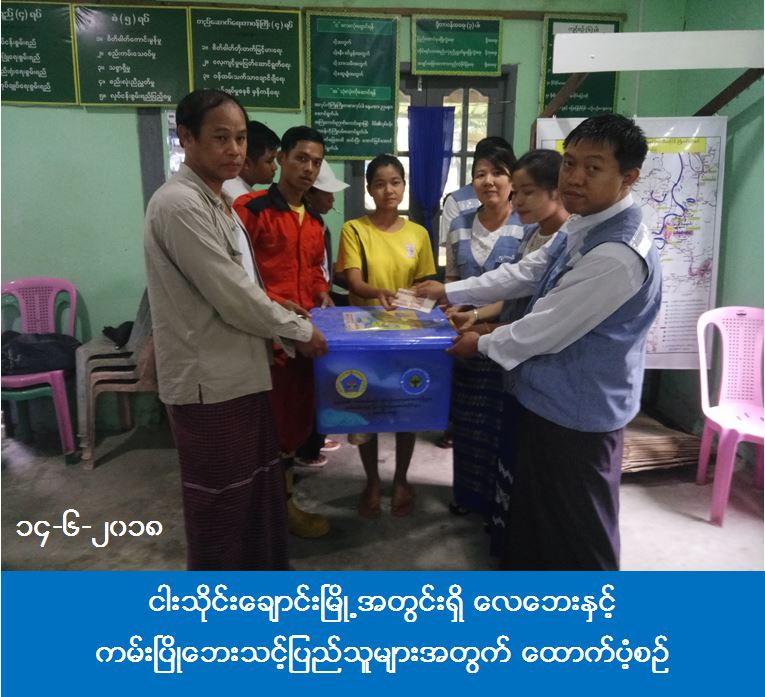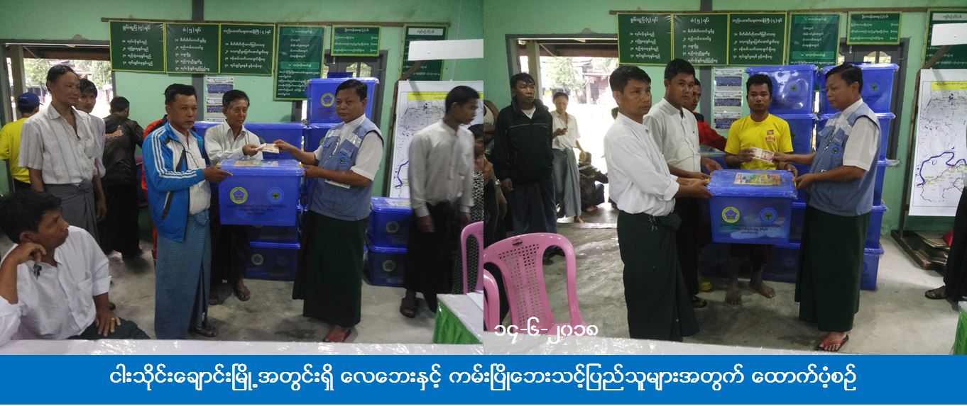 လူမှုဝန်ထမ်း၊ ကယ်ဆယ်ရေးနှင့် ပြန်လည်နေရာချထားရေးဝန်ကြီးဌာန၊ ဘေးအန္တရာယ်ဆိုင်ရာစီမံခန့်ခွဲမှုဦးစီးဌာန၊ ဧရာဝတီတိုင်းဒေသကြီးဦးစီးမှူးရုံးမှ တာဝန်ရှိသူများသည် ဧရာဝတီတိုင်းဒေသကြီး၊ ပုသိမ်ခရိုင်၊ ရေကြည်မြို့နယ်၊ ငါးသိုင်းချောင်းမြို့၊ မြို့မရပ်ကွက်၊ ငဝန်ရပ်ကွက်နှင့် ရွှေဘိုရပ်ကွက်တို့၌ (၁၃-၆-၂၀၁၈) ရက်နေ့တွင် ဖြစ်ပွားခဲ့သော လေပြင်းတိုက်ခတ်မှုကြောင့် ပြိုကျနေအိမ် (၃)လုံးအတွက် ကယ်ဆယ်ရေးပစ္စည်း (၁၆)မျိုး (၃)အိမ်ထောင်စာ၊ အိမ်ဆောက်ပစ္စည်းဖိုးရန်ပုံငွေ (၃၀၀၀၀၀ိ/-)၊ အမိုးလန်ပျက်စီးခဲ့သည့်နေအိမ် (၂၁)လုံးအတွက် ကယ်ဆယ်ရေးပစ္စည်း (၁၀)မျိုး (၂၁)အိမ်ထောင်စာ၊ အိမ်ဆောက်ပစ္စည်းဖိုး (၁၀၅၀၀၀၀ိ/-)၊ ငါးသိုင်းချောင်းမြို့၊ မြစ်ဆယ်ကျေးရွာအုပ်စု၊ မြစ်ဆယ်ကျေးရွာ၌ (၁၃-၆-၂၀၁၈) ရက်နေ့တွင် ဖြစ်ပွားခဲ့သော ကမ်းပြိုဘေးကြောင့် ပြောင်းရွှေ့နေအိမ် (၁)လုံးအတွက် ကယ်ဆယ်ရေးပစ္စည်း (၁၀)မျိုး (၁) အိမ်ထောင်စာ၊ အိမ်ဆောက်ပစ္စည်းဖိုး (၁၀၀၀၀၀ိ/-)၊ စုစုပေါင်းနေအိမ် (၂၅)လုံး၊ အိမ်ထောင်စု (၂၅)စုမှ လူဦးရေ (၁၁၂)ဦးအတွက် (၂၃၅၂၀၀ိ/-)နှင့် အမိုးလန်ပျက်စီးခဲ့သည့် ဇောတိကဘုန်းတော်ကြီးအတွက် ကျောင်းဆောက်ရန်ပုံငွေ (၁၀၀၀၀၀ိ/-)အား (၁၄-၆-၂၀၁၈) ရက်နေ့၊ (၁၄း၁၅) နာရီအချိန်တွင် လေဘေးသင့်ပြည်သူများ၏ လက်ဝယ်အရောက် ကွင်းဆင်းထောက်ပံ့ခဲ့ကြောင်း သိရှိရပါသည်။