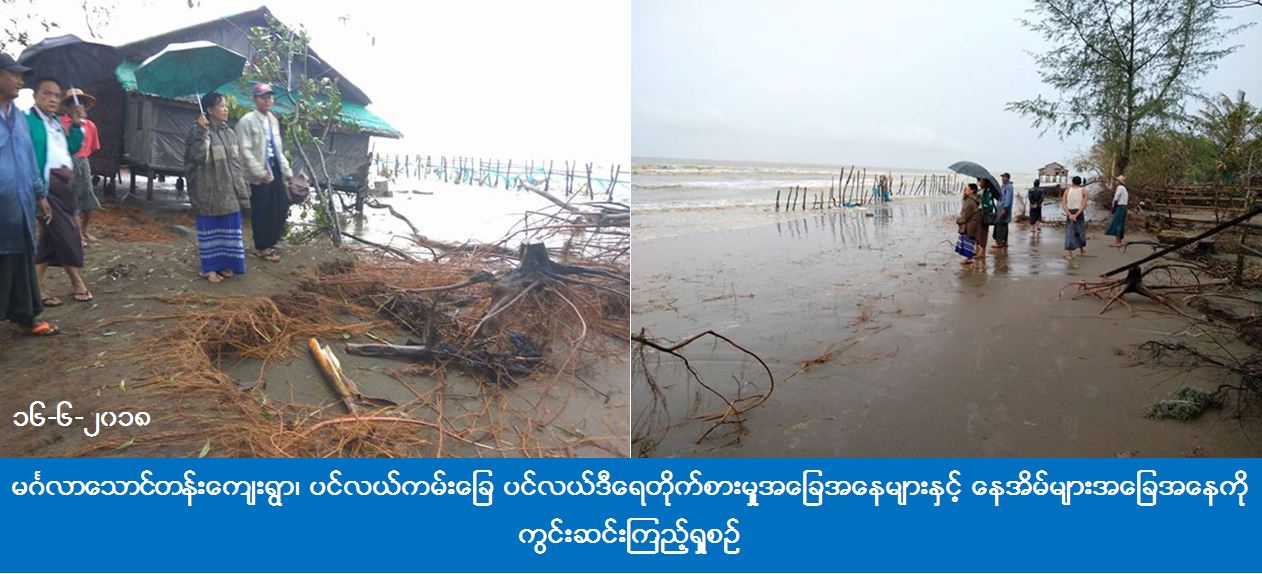 လူမှုဝန်ထမ်း၊ ကယ်ဆယ်ရေးနှင့် ပြန်လည်နေရာချထားရေးဝန်ကြီးဌာန၊ ဘေးအန္တရာယ်ဆိုင်ရာစီမံခန့်ခွဲမှုဦးစီးဌာန၊ ဖျာပုံခရိုင်ဦးစီးမှူးရုံးမှ တာဝန်ရှိသူများသည် ဖျာပုံမြို့နယ်၊ အမာမြို့၊ နောက်မီးကျေးရွာအုပ်စု၊ တောကျိုးအမာစုကျေးရွာနှင့် မင်္ဂလာသောင်တန်းကျေးရွာတို့၌ (၁၃-၆-၂၀၁၈) ရက်နေ့နှင့် (၁၄-၆-၂၀၁၈) ရက်နေ့များတွင် ပင်လယ်ဒီရေမြင့်တက်ပြီး လှိုင်းရိုက်ခတ်မှုကြောင့် ပင််လယ်ကမ်းစပ်နေအိမ် (၁၆) လုံး ပြိုကျပျက်စီးခဲ့ပြီး နေအိမ် (၈) လုံး ယိုင်နဲ့ခဲ့ရာ ပြိုကျခဲ့သည့်အိမ် (၁၆) လုံးအတွက်် ကယ်ဆယ်ရေးပစ္စည်း ၁၅ မျိုး (၁၆) အိမ်ထောင်စာ၊ ယိုင်နဲ့အိမ် (၈) လုံးအတွက် ကယ်ဆယ်ရေးပစ္စည်း ၁၀ မျိုး (၈) အိမ်ထောင်စာ၊ အိမ်ဆောက်ပစ္စည်းဖိုးငွေ (၁၇၆၀၀၀၀ိ/-)၊ဆန်ဖိုးငွေ (၂၇၀၉၀၀ိ/-) တို့ကို (၁၆-၆-၂၀၁၈) ရက်နေ့တွင် သွားရောက်ထောက်ပံ့ခဲ့ပြီး ဘေးခံစားရသည့်ပြည်သူများအား အားပေးစကားပြောကြားခဲ့ပါသည်။ ထို့နောက် ခဲ့ပြီး ယခင်ရွာလယ်လမ်းအသုံးပြုနေသည့်နေရာအထိ တိုက်စားခဲ့ကြောင်း တွေ့ရှိခဲ့ရကာ ပင်လယ်ဒီရေကျဆင်းပြီး ပုံမှန်အချိန်ကျရောက်သည်နှင့် ဒီရေဒဏ်ခံနိုင်သည့် ကြီးမြန်သစ်ပင်များ အမြန်ပြန်စိုက်နိုင်ရေး ပြောကြားခဲ့ကြောင်း သိရှိရပါသည်။