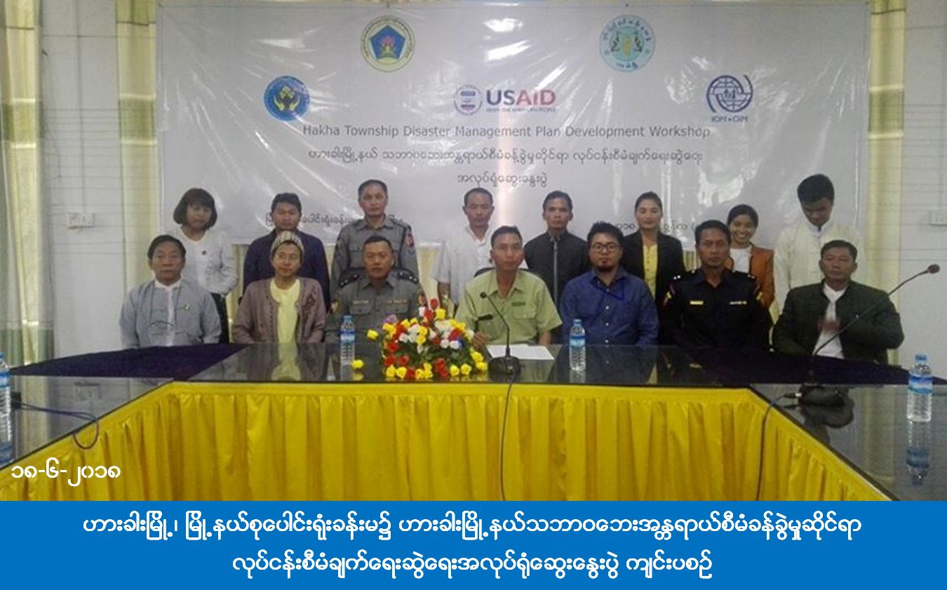 လူမှုဝန်ထမ်း၊ ကယ်ဆယ်ရေးနှင့် ပြန်လည်နေရာချထားရေးဝန်ကြီးဌာန၊ ဘေးအန္တရာယ်ဆိုင်ရာစီမံခန့်ခွဲမှုဦးစီးဌာန၊ ချင်းပြည်နယ်ဦးစီးမှူးရုံးမှ တာဝန်ရှိသူများသည် ရွှေ့ပြောင်းသွားလာနေထိုင်ခြင်းဆိုင်ရာ နိုင်ငံတကာအဖွဲ့အစည်း (IOM) နှင့်ပူးပေါင်း၍ ချင်းပြည်နယ်၊ ဟားခါးခရိုင်၊ ဟားခါးမြို့၊ မြို့နယ်စုပေါင်းရုံးခန်းမ၌ (၁၈-၆-၂၀၁၈) ရက်နေ့တွင် ဟားခါးမြို့နယ်သဘာဝဘေးအန္တရာယ်စီမံခန့်ခွဲမှုဆိုင်ရာ လုပ်ငန်းစီမံချက်ရေးဆွဲရေးအလုပ်ရုံဆွေးနွေးပွဲ ကို ကျင်းပပြုလုပ်ခဲ့ရာ မြို့နယ်အဆင့် ဌာနဆိုင်ရာတာဝန်ရှိသူစုစုပေါင်း (၁၇) ဦး တက်ရောက်ခဲ့ကြပါသည်။ အဆိုပါ အလုပ်ရုံဆွေးနွေးပွဲကို (၁၈-၆-၂၀၁၈) ရက်နေ့မှ (၁၉-၆-၂၀၁၈) ရက်နေ့အထိ (၂) ရက်ကြာ ကျင်းပပြုလုပ်သွားမည်ဖြစ်ကြောင်း သိရှိရပါသည်။