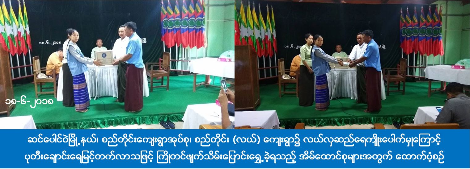 လူမှုဝန်ထမ်း၊ ကယ်ဆယ်ရေးနှင့် ပြန်လည်နေရာချထားရေးဝန်ကြီးဌာန၊ ဘေးအန္တရာယ်ဆိုင်ရာစီမံခန့်ခွဲမှုဦးစီးဌာန၊ သရက်ခရိုင်ဦးစီးမှူးရုံးမှ တာဝန်ရှိသူများသည် ဆင်ပေါင်ဝဲမြို့နယ်၊ စည်တိုင်းကျေးရွာအုပ်စု၊ စည်တိုင်း (လယ်) ကျေးရွာ၌ (၁၄-၆-၂၀၁၈) ရက်နေ့တွင် လယ်လှဆည်ရေကျိုးပေါက်မှုကြောင့် ပုတီးချောင်းရေမြင့်တက်လာသဖြင့် ကြိုတင်ဖျက်သိမ်းပြောင်းရွှေ့ခဲ့ရသည့် နေအိမ်(၁၀)လုံးအတွက် အိမ်ဆောက်ပစ္စည်းဖိုး (၁၀၀၀၀၀၀ိ/-)၊ လူဦးရေ (၃၉) ဦးအတွက် ဆန်ရိက္ခာဖိုး(၇) ရက်စာ (၈၁၉၀၀ိ/-) ထောက်ပံ့ရန်ပုံငွေစုစုပေါင်း (၁၀၈၁၉၀၀ိ/-)နှင့် ကယ်ဆယ်ရေးပစ္စည်း (၉) မျိုး (၁၀) အိမ်ထောင်စာကို (၁၈-၆-၂၀၁၈) ရက်နေ့တွင် ဆင်ပေါင်ဝဲမြို့နယ်အထွေထွေအုပ်ချ ုပ်ရေးဦးစီးဌာနမှ တာဝန်ရှိသူများရှေ့မှောက်တွင် သက်ဆိုင်ရာကျေးရွာအုပ်ချုပ်ရေးမှူးနှင့် ကျေးရွာစာရေး လက်ဝယ်သို့ ထောက်ပံ့ပေးအပ်ခဲ့ကြောင်း သိရှိရပါသည်။