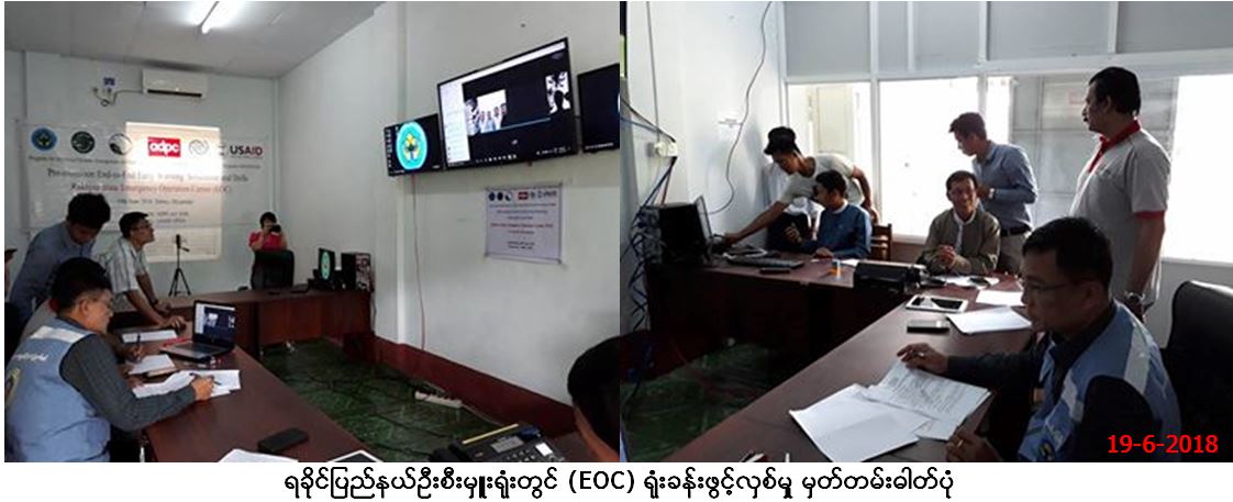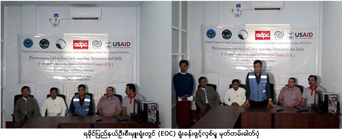 လူမှုဝန်ထမ်း၊ ကယ်ဆယ်ရေးနှင့် ပြန်လည်နေရာချထားရေးဝန်ကြီးဌာန၊ ဘေးအန္တရာယ်ဆိုင်ရာစီမံခန့်ခွဲမှုဦးစီးဌာန၊ ရခိုင်ပြည်နယ်ဦးစီးမှူးရုံးမှ တာဝန်ရှိသူများသည် ယနေ့ (၁၉-၆-၂၀၁၈) ရက် (၀၈း၃၀)နာရီ၌ ရခိုင်ပြည်နယ်ဦးစီးမှူးရုံးတွင် အရေးပေါ်အခြေအနေစီမံခန့်ခွဲမှုဗဟိုဌာန (Emergency Operation Centre – EOC)ရုံးခန်းဖွင့်လှစ်ခဲ့ပြီး စစ်တွေ၊ ပေါက်တော၊ မြေပုံ၊ မင်းပြား(၄)မြို့နယ်တို့နှင့်အတူ မုန်တိုင်းသဏ္ဍာန် တူဇာတ်တိုက်လေ့ကျင့်ခြင်းများ တပြိုင်တည်း ဆက်လက်ဆောင်ရွက်ခဲ့ကြောင်း သတင်းရရှိပါသည်။