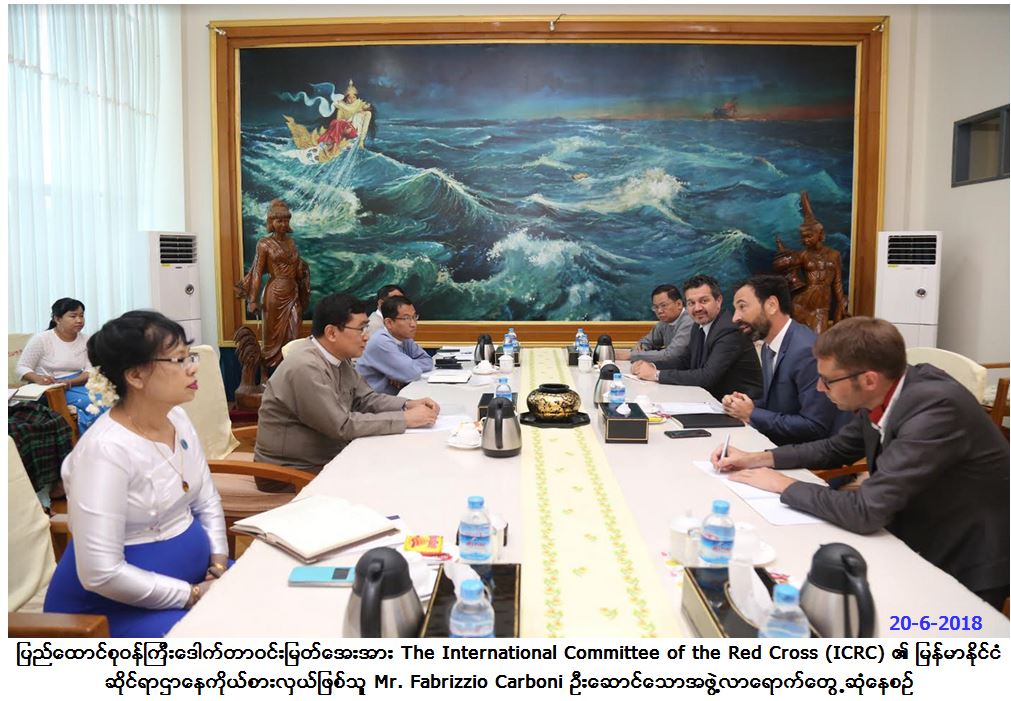 ထိုသို့တွေ့ဆုံရာတွင် ဝန်ကြီးဌာနအနေဖြင့် စိန်ခေါ်မှုများအား အောင်မြင်စွာကျော်ဖြတ်နိုင်ပြီး ICRC နှင့် ပူးပေါင်းဆောင်ရွက်ခဲ့မှုများအတွက် ဂုဏ်ယူပါ ကြောင်း၊ ရခိုင်ပြည်နယ်၊ ရှမ်းပြည်နယ်နှင့် ကချင်ပြည်နယ်တို့တွင် လုပ်ငန်းတိုးချဲ့ဆောင်ရွက်နိုင်ရန် ဝန်ကြီးဌာနနှင့် ပိုမိုပူးပေါင်းဆောင်ရွက်လိုပါကြောင်း၊ နိုင်ငံတော်အစိုးရ၏ ရည်မှန်းချက်နှင့်မူဝါဒများအား အကောင်အထည်ဖော်ရာတွင် ICRC အနေဖြင့် ကူညီပံ့ပိုးပေးလိုပါကြောင်း၊ ရခိုင်ပြည်နယ်အတွင်း နေရပ် စွန့်ခွာသူများအား လူသားချင်း စာနာကူညီမှုများထောက်ပံ့ရာတွင် မိုးရာသီအတွင်း ဝေးလံသောနေရပ်များအတွက် (၂)လစာ အပြည့်အဝ ထောက်ပံ့ရေး ဆောင်ရွက်နေမှုများ၊ ရခိုင်ပြည်နယ်အတွင်း အလုပ်နှင့်လုပ်ခလစာ ထောက်ပံ့ရေး (Cash for Work) အစီအစဉ်အား ICRC မှ အောင်မြင်စွာ အကောင် အထည်ဖော်ခဲ့မှုများ၊ ရခိုင်ပြည်နယ် အလယ်ပိုင်းနှင့် မြောက်ပိုင်းတို့တွင် အိမ်ထောင်စု (၇၀၀၀)အတွက် မျိုးစေ့၊ ကိရိယာနှင့် ဓါတ်မြေသြဇာများ ထောက်ပံ့ပေး မည့်အစီအစဉ်များ၊ လူသားချင်းစာနာကူညီမှုများမှတဆင့် အမှီအခိုကင်းစွာ ၎င်းတို့ကိုယ်တိုင် ရပ်တည်နိုင်ရေးထောက်ပံ့ပေးနိုင်မည့်ကိစ္စများ၊ ရခိုင် ပြည်နယ် အတွင်း အပေါင်းလက္ခဏာဆောင်သော တိုးတက်မှုများတွေ့မြင်ရပြီး ယခုထက်ပိုမို ကူညီ လိုပါကြောင်း ရှင်းလင်းဆွေးနွေးပြီး ဝန်ကြီးဌာနအနေဖြင့် ပြည်သူများ လူမှုစီးပွားဘဝတိုးတက်စေရေး၊ တရားဥပဒေစိုးမိုးရေး၊ အမျိုးသားပြန်လည်စည်းလုံးညီညွတ်ရေး၊ ပြည်တွင်းငြိမ်းချမ်းရေးနှင့် ဒီမိုကရေစီဖက်ဒရယ် ပြည်ထောင်စုြ ဖစ်ပေါ်လာရေးစသည့် နိုင်ငံတော်အစိုးရ၏မူဝါဒ၊ ရည်မှန်းချက်များနှင့်အညီ ကြိုးပမ်းဆောင်ရွက်နေမှုများ၊ ဘေးအန္တရယ်ထိခိုက်ခံစားရသူများအား အချိန်နှင့် တပြေးညီ ကူညီထောက်ပံ့နေပြီး ပြည်သူများ လူ့အခွင့်အရေး အပြည့်အဝရရှိပြီး လူ့ဂုဏ်သိက္ခာနှင့်အညီ ရပ်တည်နေထိုင်နိုင်ရေး လူမှုစီးပွားဘဝဖွံ့ဖြိုး တိုးတက်ရေးအတွက် သက်ဆိုင်ရာဝန်ကြီးဌာနများ၊ အဖွဲ့အစည်းများနှင့် ပူးပေါင်းအကောင်အထည် ဖော်ဆောင်နေမှုများ၊ ဝန်ကြီးဌာနအနေဖြင့် ICRC နှင့် ရှေ့ဆက်လက် လက်တွဲဆောင်ရွက်ရန်ကိစ္စရပ်များကို ဆွေးနွေးခဲ့ကြပြီး တာဝန်ပြီးဆုံး၍ ပြန်လည် ထွက်ခွာတော့မည့် ဌာနေကိုယ်စားလှယ်ဖြစ်သူ Mr. Fabrizzio Carboni အား နှုတ်ဆတ်စကားပြောကြားခဲ့ကြောင်း သတင်းရရှိပါသည်။