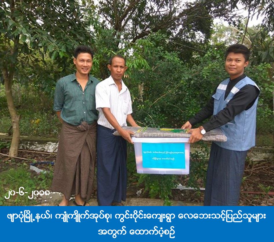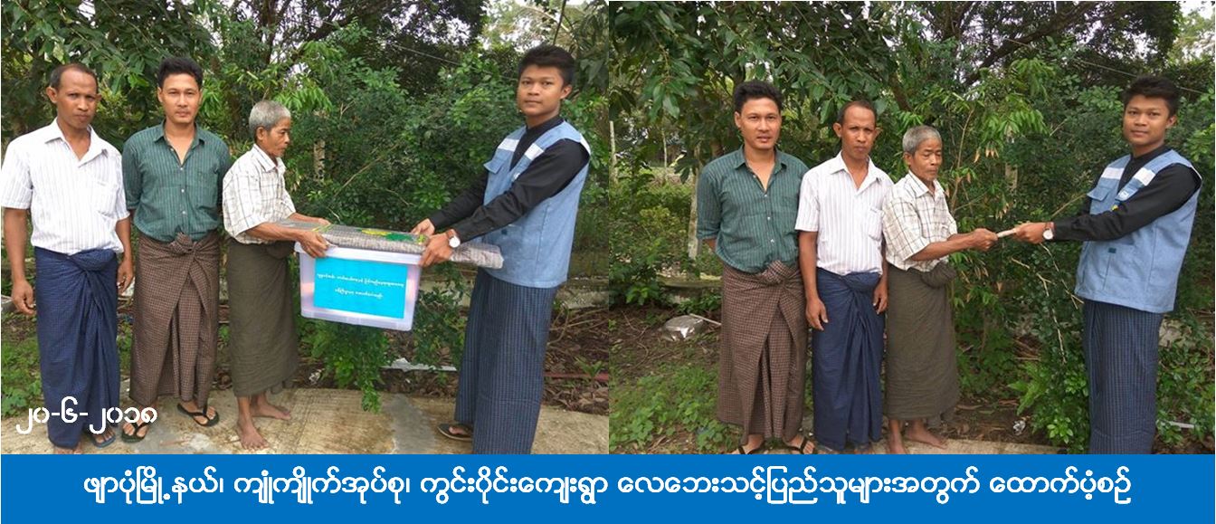 လူမှုဝန်ထမ်း၊ ကယ်ဆယ်ရေးနှင့် ပြန်လည်နေရာချထားရေးဝန်ကြီးဌာန၊ ဘေးအန္တရာယ်ဆိုင်ရာ စီမံခန့်ခွဲမှုဦးစီးဌာန၊ ဖျာပုံခရိုင်ဦးစီးမှူးရုံးမှ တာဝန်ရှိသူများသည် ဖျာပုံမြို့နယ်၊ ကျုံကျိုက်အုပ်စု၊ ကွင်းဝိုင်းကျေးရွာ၌ (၁၂-၆-၂၀၁၈) ရက်နေ့နှင့် (၁၃-၆-၂၀၁၈) ရက်နေ့တို့တွင် မိုးသက်လေပြင်းတိုက်ခတ်မှုကြောင့် ပြိုလဲခဲ့သည့်နေအိမ် (၂) လုံးအတွက် ကယ်ဆယ်ရေးပစ္စည်း (၁၆) မျိုး (၂) အိမ်ထောင်စာ၊ လူဦးရေ (၂) ဦးအတွက် ဆန် (၇) ရက်စာဘိုးငွေ (၄၂၀၀) ကျပ်နှင့် အိမ်ဆောက်ပစ္စည်းဖိုးငွေ (၂) သိန်းကျပ်တိတိတို့ကို (၂၀-၆-၂၀၁၈) ရက်နေ့တွင် လေဘေးသင့်ပြည်သူလက်ဝယ်သို့ ထောက်ပံ့ပေးအပ်ခဲ့ကြောင်း သိရှိရပါသည်။
