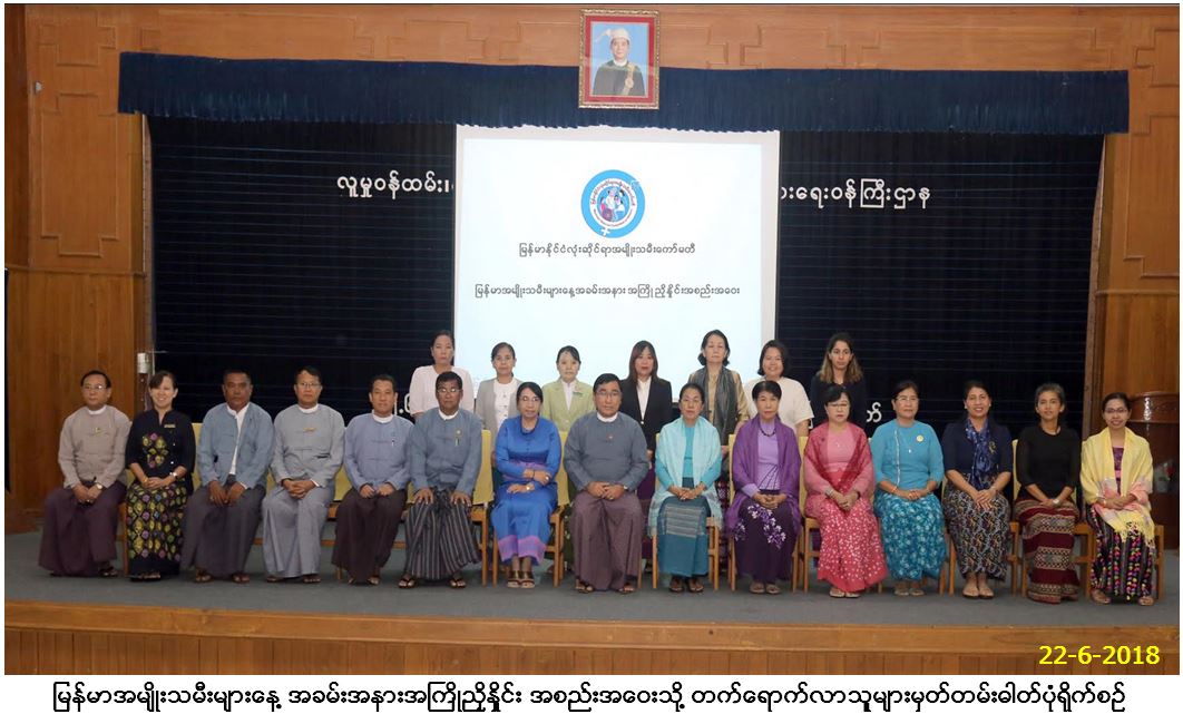 ၂၂-၆-၂၀၁၈ ရက်နေ့၊ နံနက်(၀၉း၃၀)နာရီမှ (၁၁း၃၀)နာရီအထိ လူမှုဝန်ထမ်း၊ ကယ်ဆယ်ရေးနှင့် ပြန်လည်နေရာချထားရေးဝန်ကြီး ဌာန၊ ဝန်ကြီးရုံးစုပေါင်း အစည်းအဝေး ခန်းမ၌ ၂၀၁၈ ခုနှစ်၊ ဇူလိုင်လ(၃)ရက်နေ့တွင် ကျရောက်မည့် မြန်မာအမျိုးသမီးများနေ့ အခမ်းအနား ကျင်းပပြုလုပ်ရန်အတွက် အကြိုညှိနှိုင်းအစည်းအဝေးကို ကျင်းပပြုလုပ်ခဲ့ရာ လူမှုဝန်ထမ်း၊ ကယ်ဆယ်ရေးနှင့် ပြန်လည်နေရာချထားရေး ဝန်ကြီးဌာန၊ ပြည်ထောင်စုဝန်ကြီးမှ ဆွေးနွေးပြောကြားရာတွင် ၁၉၉၅ ခုနှစ်၊ တရုတ်ပြည်သူ့ သမ္မတနိုင်ငံ၊ ပေကျင်းမြို့တွင် ကျင်းပခဲ့သော စတုတ္ထအကြိမ်မြောက် ကမ္ဘာ့အမျိုးသမီးညီလာခံသို့ မြန်မာကိုယ်စားလှယ်များသည် အဖွဲ့ဝင်အဖြစ် တက်ရောက်ခဲ့ပါကြောင်း၊ ယင်းညီလာ ခံကြီးမှ နိုင်ငံတော်အဆင့် လုပ်ငန်းယန္တရားတစ်ခု ဖွဲ့စည်းဆောင်ရွက်ရန်နှင့်် အမျိုးသမီးများ ဖွံ့ဖြိုး တိုးတက်ရေးအတွက် လုပ်ငန်းအစီအစဉ် (Plan of Action)များ ရေးဆွဲဆောင်ရွက်သွားရန်ဟူ၍ လုပ်ငန်းစဉ်(၂)ရပ် ချမှတ်ခဲ့ပါကြောင်း၊ မြန်မာနိုင်ငံလုံးဆိုင်ရာအမျိုးသမီးကော်မတီ (ယခင် မြန်မာနိုင်ငံလုံးဆိုင်ရာ အမျိုးသမီးရေးရာကော်မတီ)ကို ၁၉၉၆ ခုနှစ်၊ ဇူလိုင်လ (၃) ရက်နေ့တွင် စတင်ဖွဲ့စည်းခဲ့ပါကြောင်း၊ မြန်မာ နိုင်ငံလုံးဆိုင်ရာ အမျိုးသမီး ရေးရာကော်မတီ စတင်ဖွဲ့စည်းခဲ့သည့် ဇူလိုင်လ (၃)ရက်နေ့ကို မြန်မာအမျိုးသမီးများနေ့ အဖြစ်သတ်မှတ်ခဲ့ပါ ကြောင်း၊ မြန်မာနိုင်ငံလုံးဆိုင်ရာ အမျိုးသမီးကော်မတီအောက်တွင် အမျိုးသမီးရေးရာအဖွဲ့ချုပ်နှင့် မိခင်နှင့် ကလေးစောင့်ရှောက်ရေး အသင်းအပါအဝင် အမျိုးသမီးတက်ကြွစွာ လှုပ်ရှားဆောင်ရွက်နေသော အသင်းအဖွဲ့များပါဝင်ကြောင်း၊ မြန်မာနိုင်ငံလုံးဆိုင်ရာ အမျိုးသမီး ကော်မတီမှကြီးမှူး၍ မြန်မာအမျိုးသမီးများနေ့ ကျင်းပခြင်းသည် ပထမဆုံးအကြိမ်အဖြစ် ကျင်းပတာဖြစ်ပါကြောင်း၊ ယခုနှစ်ကျင်းပရာတွင် နေပြည်တော် ကောင်စီနယ်မြေအပါအဝင် ပြည်နယ်နှင့်တိုင်းအသီးသီးရှိ အမျိုးသမီးကော်မတီဝင်များ၊ အမျိုးသမီးအရေး တက်ကြွလှုပ်ရှားသူ များ ပါဝင်ဆောင်ရွက်ကြရန်ဖြစ်ကြောင်း၊ နိုင်ငံတော်က အမျိုးသမီးကဏ္ဍဖွံ့ဖြိုး တိုးတက်ရေးကြိုးပမ်း ဆောင်ရွက်မှုများနှင့် နိုင်ငံတော်ဖွံ့ဖြိုး တိုးတက်ရေး ကြိုးပမ်းဆောင်ရွက်မှုများမှာ မြန်မာအမျိုးသမီးထုကြီး တစ်ရပ်လုံး တစ်စိတ်တစ်ဝမ်းတည်း စုစည်းညီညွတ်စွာ လှုပ်ရှားဆောင် ရွက်သွားရန်နှင့် မြန်မာအမျိုးသမီးများနေ့ အထိမ်းအမှတ် အခမ်းအနားအား အောင်မြင်စွာဆောင်ရွက်နိုင်ရန်အတွက် အကြိုညှိနှိုင်း အစည်း အဝေးကို ကျင်းပရခြင်းဖြစ်ကြောင်း ရှင်းလင်းပြောကြားခဲ့ပါသည်။