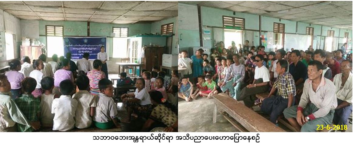 လူမှုဝန်ထမ်း၊ ကယ်ဆယ်ရေးနှင့် ပြန်လည်နေရာချထားရေးဝန်ကြီးဌာန၊ ဘေးအန္တရာယ်ဆိုင်ရာစီမံခန့်ခွဲမှုဦးစီးဌာန၊ မြောက်ဦးခရိုင်ဦးစီးမှူးရုံးမှ တာဝန်ရှိသူများသည် မြောက်ဦးခရိုင်ဦးစီးမှူးရုံးမှဦးဆောင်၍ (၂၃-၆-၂၀၁၈)ရက်နေ့ နံနက်(၁၁း၀၀)အချိန်မှ နေ့လည် (၁၂း၃၀)အချိန်ထိ မြောက်ဦးမြို့နယ်၊ သဘောကျေးရွာစာသင်ကျောင်၌ ကျေးရွာသူ/သား(၁၀၅)ဦးတို့အားလည်းကောင်း နေ့လည်(၁၃း၃၀)အချိန်မှ (၁၅း၃၀) အချိန်ထိ မြောက်ဦးမြို့နယ်၊ ငါးခူတောင်ကျေးရွာစာသင်ကျောင်း၌ ကျေးရွာသူ/သား(၁၂၀)ဦးတို့အားလည်းကောင်း သဘာဝဘေးအန္တရာယ်နှင့် ပတ်သက်သည့် ဆောင်ရန်/ရှောင်ရန်များဟောပြောပြီး ဘေး(၈)မျိုးလက်ကမ်းစာစောင်များအား တက်ရောက်လာသူများ ထံဖြန့်ဝေပေး ခဲ့ကြောင်း သတင်းရရှိပါသည်။