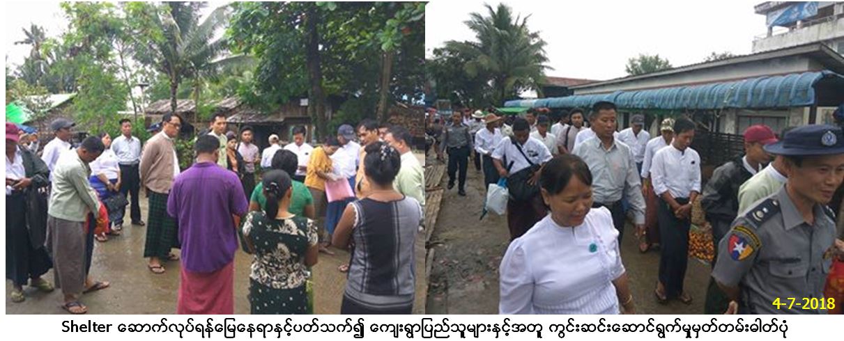လူမှုဝန်ထမ်း၊ ကယ်ဆယ်ရေးနှင့် ပြန်လည်နေရာချထားရေးဝန်ကြီးဌာန၊ ဘေးအန္တရာယ်ဆိုင်ရာစီမံခန့်ခွဲမှုဦးစီးဌာန၊ ဖျာပုံခရိုင်ဦးစီးမှူးရုံးမှ တာဝန်ရှိသူများသည် ဇူလိုင်လ (၃)ရက်နေ့တွင် အမျိုးသားလွှတ်တော်ကိုယ်စားလှယ်ဦးသိန်းဆွေ၊ ပြည်သူ့လွှတ်တော်ကိုယ်စားလှယ်ဦး ဝင်းထွဋ်၊ ဖျာပုံခရိုင်အုပ်ချုပ်ရေးမှူးဦးအေးလွင်၊ ခရိုင်/မြို့နယ်ဌာနဆိုင်ရာ တာဝန်ရှိသူများနှင့်အတူ ဒေါ်ငြိမ်းကျေးရွာအုပ်စု၊ ဒေါ်ငြိမ်း ကျေးရွာ၊ ပက်ပြဲကျေးရွာတို့တို့ကွင်းဆင်းပြီး ရှယ်လ်တာဆောက်လုပ်ရန်မြေနေရာကိစ္စ၊ ဈေးမြေနေရာကိစ္စတို့နှင့်ပတ်သက်၍ ကျေးရွာပြည်သူများနှင့် အတူ ကွင်းဆင်းတွေ့ဆုံခြင်းခရီးစဉ်တွင် အတူလိုက်ပါဆောင်ရွက်ခဲ့ကြောင်း သတင်းရရှိပါသည်။