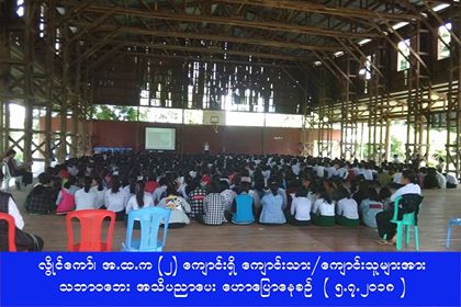 လူမှုဝန်ထမ်း၊ ကယ်ဆယ်ရေးနှင့် ပြန်လည်နေရာချထားရေးဝန်ကြီးဌာန၊ ဘေးအန္တရာယ်ဆိုင်ရာစီမံခန့်ခွဲမှုဦးစီးဌာန၊ ကယားပြည်နယ်ဦးစီးမှူးရုံးမှ တာဝန်ရှိသူများသည် (၅.၇.၂၀၁၈)ရက်နေ့တွင် ကယားပြည်နယ်၊ လွိုင်ကော်၊ အ.ထ.က(၂)ကျောင်းရှိ ကျောင်းသား/ ကျောင်းသူ(၇၅၀)ဦးအား သဘာဝဘေးအန္တရာယ်ဆိုင်ရာအသိပညာပေးဟောပြောခဲ့ပြီး လက်ကမ်းစာစောင်များဖြန့်ဝေပေးခဲ့ကြောင်း သတင်းရရှိပါသည်။