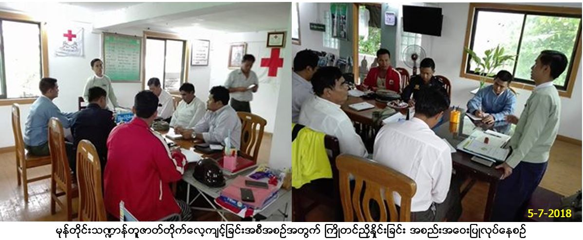 လူမှုဝန်ထမ်း၊ ကယ်ဆယ်ရေးနှင့် ပြန်လည်နေရာချထားရေးဝန်ကြီးဌာန၊ ဘေးအန္တရာယ်ဆိုင်ရာစီမံခန့်ခွဲမှုဦးစီးဌာန၊ ဘိုကလေးမြို့နယ်ဦးစီး မှူးရုံးမှ တာဝန်ရှိသူများသည် ဘိုကလေးမြို့နယ်၊ ချောင်းဗြဲကြီးကျေးရွာအုပ်စု၊ ဂွေးချောင်းကြီးကျေးရွာတွင် (၁၅.၇.၂၀၁၈)ရက်နေ့တွင် ကျင်းပ ပြုလုပ်မည့် မုန်တိုင်းသဏ္ဍာန်တူဇာတ်တိုက်လေ့ကျင့်ခြင်း အစီအစဉ်အတွက် ကြိုတင်ညှိနှိုင်းခြင်း အစည်းဝေးကို ယနေ့ (၆.၇.၂၀၁၈)ရက်နေ့ (၉:၃၀)နာရီအချိန်တွင် ဘိုကလေးမြို့နယ်ဦးစီးမှူးရုံးတွင် ကျင်းပပြုလုပ်ခဲ့ပါသည်။ ထိုအစည်းဝေးကို ဒုတိယမြို့နယ်အုပ်ချုပ်ရေးမှူး မြို့နယ် မီးသတ်ဦးစီးမှူး၊ မြို့နယ်ကြက်ခြေနီတာဝန်ခံ၊ ချောင်းဗြဲကြီးကျေးရွာအုပ်စုအုပ်ချုပ်ရေးမှူး၊ ဘိုကလေးမြို့စေတနာ့ဝန်ထမ်းအဖွဲ့ခေါင်းဆောင် စိုပြေမြန်မာလူမှုကူညီရေးအသင်းတာဝန်ခံ၊ Arche no va လူမှုကူညီရေးအဖွဲ့မှ တာဝန်ခံတို့ တက်ရောက်ခဲ့ကြောင်း သတင်းရရှိပါသည်။