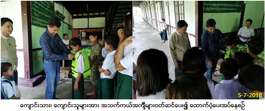 လူမှုဝန်ထမ်း၊ ကယ်ဆယ်ရေးနှင့် ပြန်လည်နေရာချထားရေးဝန်ကြီးဌာန၊ ဘေးအန္တရာယ်ဆိုင်ရာစီမံခန့်ခွဲမှုဦးစီးဌာနမှ ညွန်ကြားရေးမှူး ဒေါက်တာ အောင်သူရိန်နှင့် ရခိုင်ပြည်နယ်ဦးစီးမှူးရုံးမှ တာဝန်ရှိသူများသည် ပေါက်တောမြို့နယ်ရှိ ရေလမ်းခရီး အသုံးပြုပြီး လှေစီး၍ ကျောင်းတက်ရ သော ပေါက်တော အထက်တန်းကျောင်းရှိ ကျောင်းသား/သူ (၁၇၅) ဦးတို့အတွက် Lifejacket (အသက်ကယ်အကျီႋ) (၁၇၅) ထည်အား (၅-၇-၂၀၁၈) ရက်နေ့တွင် ကျောင်းသား/သူများလက်ဝယ်သို့ တိုက်ရိုက်သွားရောက်ထောက်ပံ့ပေးအပ်ခဲ့ကြောင်း သတင်းရရှိပါသည်။