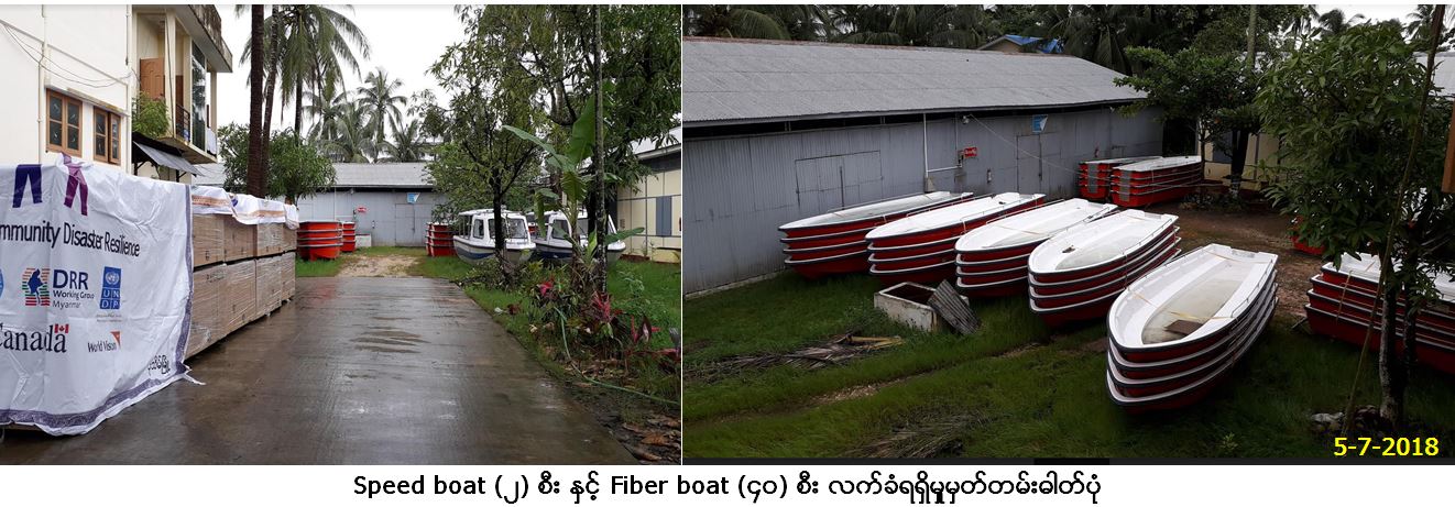 လူမှုဝန်ထမ်း၊ ကယ်ဆယ်ရေးနှင့် ပြန်လည်နေရာချထားရေးဝန်ကြီးဌာန၊ ဘေးအန္တရာယ်ဆိုင်ရာစီမံခန့်ခွဲမှုဦးစီးဌာန၊ ဧရာဝတီတိုင်းဒေသကြီး ဦးစီးမှူးရုံးမှ တာဝန်ရှိသူများသည် ကမ္ဘာ့ဘဏ်၏ အရေးပေါ်တုံ့ပြန်မှုဆိုင်ရာ အစီအစဉ် (IRM)ဖြင့် ဘေးအန္တရာယ်ဆိုင်ရာစီမံခန့်ခွဲမှု လုပ်ငန်းများ တွင် အသုံးပြုနိုင်ရန်အတွက် Speed boat (၂)စီး နှင့် Fiber boat (၄၀)စီးတို့အား (၆-၇-၂၀၁၈) ရက်နေ့၌ တိုင်းဒေသကြီးဦးစီးမှူးရုံး၊ ပုသိမ် သိုလှောင်ရုံတွင် ကောင်းမွန်စွာ လက်ခံရရှိပြီးဖြစ်ကြောင်း သတင်းရရှိပါသည်။