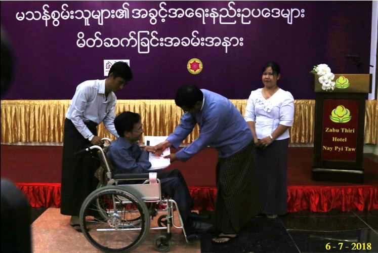 ယနေ့အခမ်းအနားသည် (၂.၃) သန်းကျော်သော မသန်စွမ်းပြည်သူများအပြင် အများပြည်သူများ မျှော်လင့်လျက်ရှိသည့် မသန်စွမ်းသူများ၏ အခွင့်အရေးနည်းဥပဒေများ မိတ်ဆက်ခြင်းအခမ်း အနား ဖြစ်ကြောင်း၊ မိမိတို့ဝန်ကြီးဌာနအနေဖြင့် မသန်စွမ်းသူများ ပြန်လည်ထူထောင်ရေးနှင့် ဖွံ့ဖြိုး တိုးတက်ရေးလုပ်ငန်းများအား သင်တန်းကျောင်းအခြေပြုနှင့် ရပ်ရွာအခြေပြုဟူ၍ ရှေးယခင်အချိန်က တည်းက အကောင်အထည်ဖော်ဆောင်ရွက်ခဲ့ပါကြောင်း ၂၀၁၁ ခုနှစ်၊ဒီဇင်ဘာ ၇ ရက်နေ့တွင် မြန်မာ နိုင်ငံအနေဖြင့် မသန်စွမ်းသူများ၏အခွင့်အရေးများဆိုင်ရာ ကုလသမဂ္ဂကွန်ဗင်းရှင်းကို အဖွဲ့ဝင်နိုင်ငံ အဖြစ် အတည်ပြုလက်မှတ်ရေးထိုးခဲ့ပြီးနောက်ပိုင်းတွင် မသန်စွမ်းသူများ၏ ပြန်လည်ထူထောင်ရေး နှင့် ဖွံ့ဖြိုးတိုးတက်ရေးလုပ်ငန်းများအားလူ့အခွင့်အရေးစံချိန်စံညွှန်းများနှင့် ကိုက်ညီမှုရှိစေရန် ပိုမို ကြိုးစားဆောင်ရွက်ခဲ့ပြီး တက်ရောက်လာသူများ မြန်မာနိုင်ငံရှိမသန်စွမ်းပြည်သူများကြိုးပမ်းမှုနှင့် ၂၀၁၅ ခုနှစ်၊ ဇွန်လ ၅ ရက်နေ့တွင် မသန်စွမ်းသူများ၏ အခွင့်အရေးဥပဒေကို ပြည်ထောင်စု လွှတ်တော်က အတည်ပြုပြဌာန်းနိုင်ခဲ့ပြီး ၂၀၁၇ ခုနှစ်၊ ဒီဇင်ဘာလ ၂၇ ရက်နေ့တွင် မသန်စွမ်းသူများ၏ အခွင့်အရေးနည်းဥပဒေကို မိမိတို့ဝန်ကြီးဌာနအနေဖြင့် ဆက်လက်၍ ထုတ်ပြန်နိုင်ခဲ့ပါကြောင်း။ ၎င်း ဥပဒေ၊ နည်းဥပဒေများကိုအကောင်အထည်ဖော် ဆောင်ရွက်မည့် မသန်စွမ်းသူများ၏ အခွင့်အရေး များဆိုင်ရာ အမျိုးသားကော်မတီကိုလည်း ဖွဲ့စည်းပေးနိုင်ခဲ့ပြီးဖြစ်ပါ၍ ယခုအခါ ဥပဒေအား အပြည့်အ၀ အကောင်အထည်ဖော်ဆောင်ရွက်နိုင်မည်ဖြစ်ပါကြောင်း၊ ဥပဒေ၊ နည်းဥပဒေများအား အဓိကအကောင်အထည်ဖော်ဆောင်ရွက်မည့် မသန်စွမ်းသူများ၏ အခွင့်အရေးများဆိုင်ရာ အမျိုးသား ကော်မတီ၊ လုပ်ငန်းကော်မတီတို့ကိုဖွဲ့စည်းနိုင်ခဲ့ပြီး ဖြစ်၍မသန်စွမ်းသူများ အနေနှင့် လူသားတိုင်း ခံစားခွင့်ရှိသည့် လူ့အခွင့်အရေးနှင့် အခြေခံလွတ်လပ်ခွင့်များအားလုံးကို တိုးတက်ရရှိလာနိုင်မည်ဖြစ် ကြောင်း၊ များမကြာသောအချိန်ကာလတစ်ခုခုတွင် လူ့အခွင့်အရေးစံချိန်စံညွှန်းများကို အများနှင့် တန်းတူ အပြည့်အ၀ခံစားရရှိနိုင်မှာဖြစ်ကြောင်း ပြောကြားခဲ့ပါသည်။