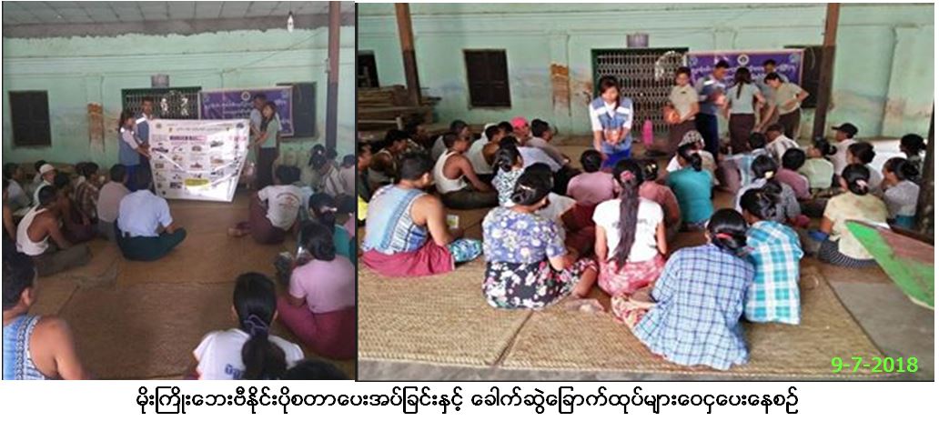 လူမှုဝန်ထမ်း၊ ကယ်ဆယ်ရေးနှင့် ပြန်လည်နေရာချထားရေးဝန်ကြီးဌာန၊ ဘေးအန္တရာယ်ဆိုင်ရာစီမံခန့်ခွဲမှုဦးစီးဌာန၊ ပြည်ခရိုင်ဦးစီးမှူးရုံးမှ တာဝန်ရှိသူများသည် ပြည်ခရိုင်၊ သဲကုန်းမြို့နယ်၊ နွယ်ကောက်ကျေးရွာအုပ်စု၊ တဲကြီးကုန်းကျေးရွာ၌ (၉.၇.၂၀၁၈)ရက်နေ့ (၁၃း၀၀)နာရီအချိန်မှ (၁၄း၀၀)နာရီအချိန်ထိ ကျေးရွာသူ၊ ကျေးရွာသား (၁၀၀)ဦးအား မိုးကြိုးဘေးအန္တရာယ်ဆိုင်ရာ အသိပညာပေးဟောပြောဆွေးနွေးခဲ့ပြီး ဘေးနှင့် ပတ်သက်သည့် လက်ကမ်းစာစောင်၊ မိုးကြိုးဘေးဗီနိုင်းပိုစတာနှင့် ခေါက်ဆွဲခြောက်ထုပ်များပေးဝေခြင်းများ ဆောင်ရွက်ခဲ့ကြောင်း သတင်းရရှိ ပါသည်။