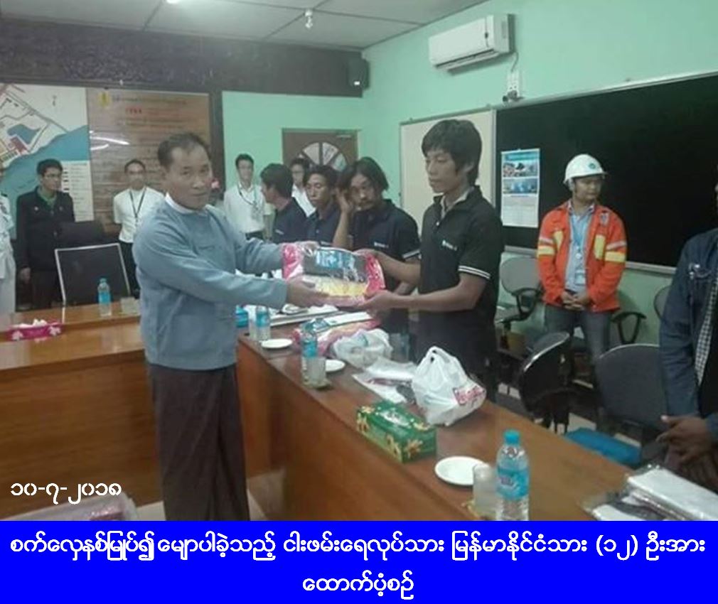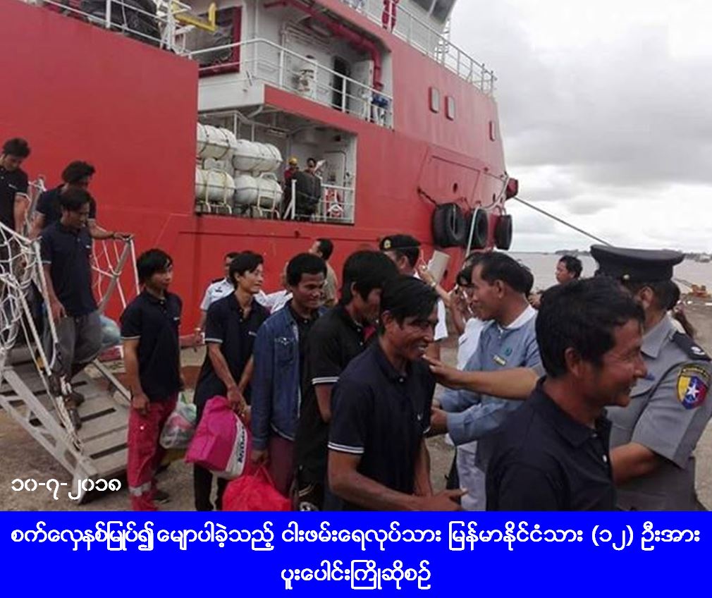 ဧရာဝတီရေတပ်စခန်းဌာနချုပ်နှင့် မြန်မာ့ဆိပ်ကမ်းအာဏာပိုင် ကိုယ်စားလှယ်လုပ်ငန်းဌာနမှ တာဝန်ယူဆောင်ရွက်ရသည့် M/S. PTTEP INTL PTE ပိုင် TUB-HAIDUONG-01 သင်္ဘောမှ တာဝန်ရှိသူများသည် (၇-၇-၂၀၁၈) ရက်နေ့တွင် ထားဝယ်ရေနံလုပ်ကွက် (M-9) ဇောတိကရေနံစင်အနီး ပင်လယ်ပြင်၌ စက်လှေနစ်မြုပ်၍ မျောပါနေသည့် ငါးဖမ်းရေလုပ်သား မြန်မာနိုင်ငံသား (၁၂) ဦးအား တွေ့ရှိသဖြင့် ပူးပေါင်းကယ်ဆယ်ခဲ့ကြပြီး အဆိုပါသင်္ဘောဖြင့် (၁၀-၇-၂၀၁၈) ရက်နေ့၊ (၁၁း၀၀) နာရီအချိန်တွင် သာကေတဆိပ်ကမ်း MOGE တံတားသို့ ငါးဖမ်းရေလုပ်သား မြန်မာနိုင်ငံသား (၁၂) ဦးနှင့်အတူ ရောက်ရှိခဲ့ရာ ဧရာဝတီရေတပ်စခန်းဌာနချုပ်မှ ဗိုလ်မှူးချုပ် ထိန်ဝင်း၊ ရေကြောင်းရဲတပ်ဖွဲ့မှ ဗိုလ်မှူး ပြုံးချို၊ သာကေတမြို့နယ်၊ အထွေထွေအုပ်ချုပ်ရေးဦးစီးဌာနမှ ဒုတိယမြို့နယ်အုပ်ချုပ်ရေးမှူး ဦးဇော်မင်းဦး၊ ရေဆိပ် လဝကမှ တာဝန်ခံ ဦးလှဘုန်း၊ PTTEP မှ တာဝန်ခံ ဦးသူရဝင်း၊ လူမှုဝန်ထမ်း၊ ကယ်ဆယ်ရေးနှင့် ပြန်လည်နေရာချထားရေးဝန်ကြီးဌာန၊ ဘေးအန္တရာယ်ဆိုင်ရာစီမံခန့်ခွဲမှုဦးစီးဌာန၊ ရန်ကုန်တိုင်းဒေသကြီးဦးစီးမှူးရုံးမှ ဦးစီးအရာရှိ ဦးမော်နိုင်ထွန်းနှင့် ရပ်ကွက်အုပ်ချုပ်ရေးမှူးတို့မှ ပူးပေါင်းကြိုဆိုခဲ့ပါသည်။
