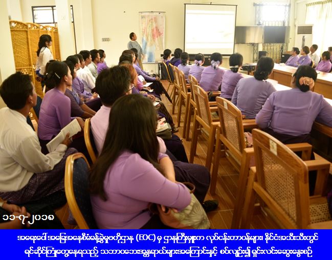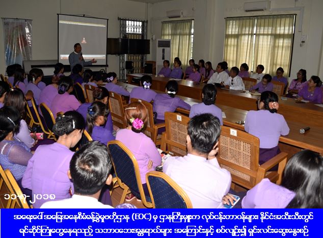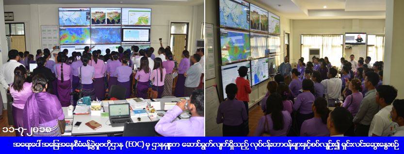 ထို့နောက် သင်တန်းသား/သူများသည် အရေးပေါ်အခြေအနေစီမံခန့်ခွဲမှုဗဟိုဌာန (EOC) အား လေ့လာကြည့်ရှုပြီး သိလိုသည်များ မေးမြန်းကြရာ တာဝန်ရှိသူ များက ပြန်လည်ရှင်းလင်းဆွေးနွေးခဲ့ကြကြောင်း သိရှိရပါသည်။