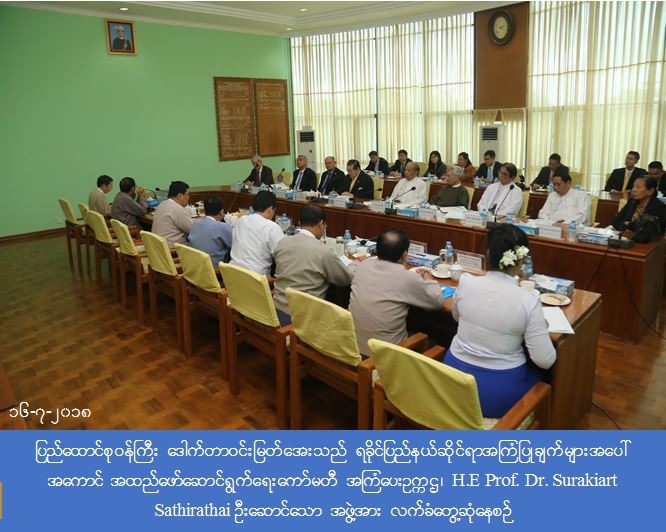 ရခိုင်ပြည်နယ်ဆိုင်ရာအကြံပြုချက်များအပေါ် အကောင်အထည်ဖော်ဆောင်ရွက်ရေးကော်မတီ အကြံပေး ဥက္ကဌ H.E Prof. Dr. Surakiart Sathirathai ဦးဆောင်သောအဖွဲ့သည် လူမှုဝန်ထမ်း၊ ကယ်ဆယ်ရေးနှင့် ပြန်လည်နေရာချထားရေးဝန်ကြီးဌာန၊ ပြည်ထောင်စုဝန်ကြီး ဒေါက်တာဝင်းမြတ်အေးအား ယနေ့ နေ့လယ်ပိုင်းတွင် အဆိုပါဝန်ကြီးရုံး အစည်းအဝေးခန်းမ၌ လာရောက်တွေ့ဆုံခဲ့ပါသည်။