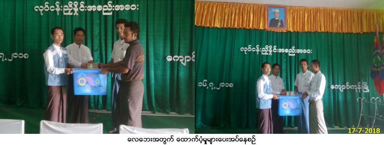 လူမှုဝန်ထမ်း၊ ကယ်ဆယ်ရေးနှင့်ပြန်လည်နေရာချထားရေးဝန်ကြီးဌာန၊ ဘေးအန္တရာယ်ဆိုင်ရာစီမံခန့့်ခွဲမှုဦးစီးဌာန၊ ဧရာဝတီတိုင်းဒေသကြီးဦးစီး မှူးရုံးမှ တာဝန်ရှိသူများသည် ဧရာဝတီတိုင်းဒေသကြီး၊ ပုသိမ်ခရိုင်၊ ကျောင်းကုန်းမြို့နယ်၊ ရောင်ပစ်ကွင်းကျေးရွာအုပ်စု၊ မကျီးစင်ကျေးရွာနှင့် ကွင်းကြီးကျေးရွာအုပ်စု၊ ကွင်းကြီးကျေးရွာတို့၌ (၁၅.၇.၂၀၁၈) ရက်နေ့နှင့် (၁၆.၇.၂၀၁၈) ရက်နေ့တို့တွင်ဖြစ်ပွားခဲ့သော လေပြင်းတိုက်ခတ်မှုကြောင့် သစ်ပင်ပိ၍ပြိုကျပျက်စီးနေအိမ် (၃)လုံး၊ အိမ်ထောင်စု (၃)စုမှ လူဦးရေ (၁၆)ဦးအတွက် ကယ်ဆယ်ရေးပစ္စည်း (၁၆)မျိုး (၃)ပုံး (၁၁၂၀၅၉ိ/-)ကျပ်၊ အိမ်ဆောက်ပစ္စည်းဖိုး (၃၀၀၀၀၀/-)ကျပ်၊ ဆန်ရိက္ခာ (၇)ရက်စာရန်ပုံငွေ (၃၃၆၀၀/-)ကျပ်၊ စုစုပေါင်းတန်ဖိုးငွေ (၄၄၅၆၅၉/-)ကျပ်တို့အား (၁၇.၇.၂၀၁၈)ရက်နေ့ (၁၃း၀၀)နာရီအချိန်တွင် ဘေးသင့်ပြည်သူများ လက်ဝယ်အရောက်ထောက်ပံ့ပေးအပ်ခဲ့ကြောင်း သတင်း ရရှိပါသည်။