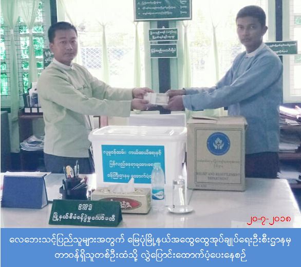 လူမှုဝန်ထမ်း၊ ကယ်ဆယ်ရေးနှင့် ပြန်လည်နေရာချထားရေးဝန်ကြီးဌာန၊ ဘေးအန္တရာယ်ဆိုင်ရာစီမံခန့်ခွဲမှုဦးစီးဌာန၊ မြောက်ဦးခရိုင်ဦးစီးမှူးရုံးမှ တာဝန်ရှိသူများသည် မြေပုံမြို့နယ်တွင်း င/ခူ ချောင်းကျေးရွာတွင် (၁၇ – ၇ – ၂၀၁၈) ရက်နေ့ မိုးသက်လေပြင်းတိုက်ခတ်မှုကြောင့် အမိုးလန်ပျက်စီးသွားသောနေအိမ် (သွပ်မိုး/ဓနိမိုး/ဝါးထရံကာ) (၂၃)လုံးအတွက် ကယ်ဆယ်ရေးပစ္စည်း (၁၀) မျိုးနှင့် အိမ်ဆောက်ပစ္စည်းဖိုး (၄၆၀,၀၀၀) ကျပ်၊ လုံးဝပျက်စီးသွားသောနေအိမ် (သွပ်မိုး/ ဓနိမိုး/ ဝါးထရံကာ) (၆) လုံးအတွက် ကယ်ဆယ်ရေးပစ္စည်း (၁၅) မျိုး၊ အိမ်ဆောက်ပစ္စည်းဖိုး (၆၀၀,၀၀၀) ကျပ်နှင့် လူဦးရေ (၁၂၂) ဦးအတွက် ဆန်ရိက္ခာ (၇) ရက်စာဖိုး (၂၅၆,၂၀၀)ကျပ်၊ စုစုပေါင်း (၁,၃၁၆,၂၀၀) ကျပ်တို့အား (၁၉-၇-၂၀၁၈) ရက်နေ့ တွင် မြေပုံမြို့နယ်အထွေထွေအုပ်ချုပ်ရေးဦးစီးဌာနသို့ သွားရောက်လွှဲပြောင်းထောက်ပံ့ပေးအပ်ခဲ့ပါသည်။