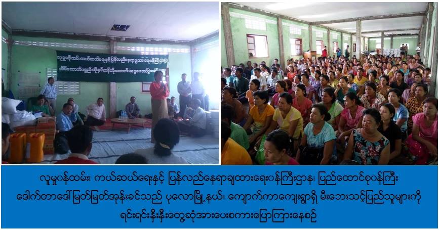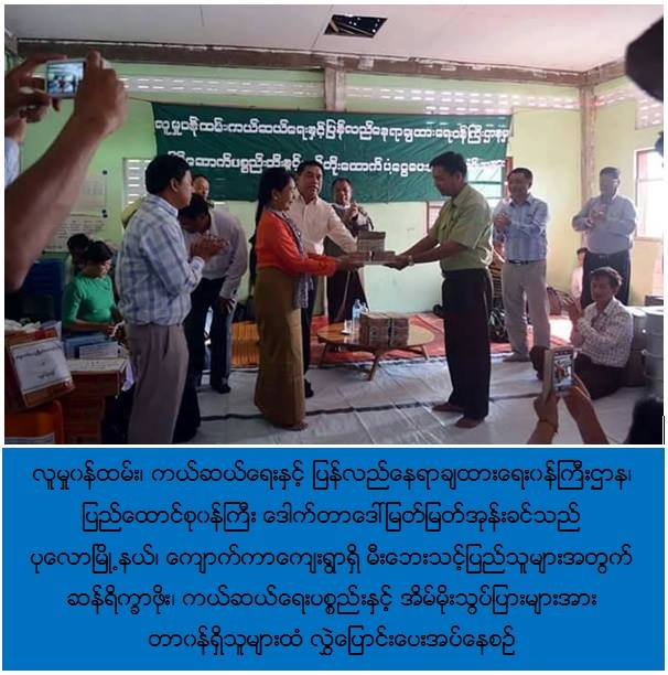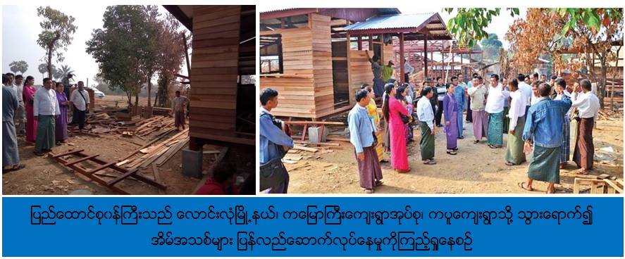ဖေဖော်ဝါရီလ (၁၆) ရက်နေ့တွင် လောင်းလုံမြို့နယ်၊ ကမြောကြီးကျေးရွာအုပ်စု၊ ကပူကျေးရွာသို့ သွားရောက်၍ မီးဘေးသင့်အိမ်ခြေ (၁၃) လုံးအတွက် တစ်အိမ်လျှင် သွပ် (၅၇) ချပ်နှုန်းဖြင့် သွပ် (၇၄၁) ချပ်ကို ထောက်ပံ့ပေးပြီး အိမ်အသစ်များ ပြန်လည်ဆောက်လုပ်နေမှုကိုကြည့်ရှုပြီး မီးဘေးသင့်အိမ်ထောင်စုဝင်များကို အားပေးစကားပြောကြားသည်။
