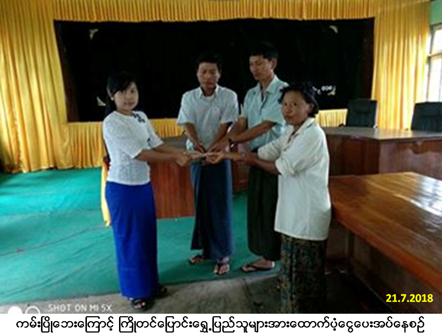 လူမှုဝန်ထမ်း၊ ကယ်ဆယ်ရေးနှင့် ပြန်လည်နေရာချထားရေးဝန်ကြီးဌာန၊ ဘေးအန္တရာယ်ဆိုင်ရာစီမံခန့်ခွဲမှုဦးစီးဌာန၊ မိုးညိုမြို့နယ်ဦးစီးမှူးရုံးမှ တာဝန်ရှိသူများသည် ပဲခူးတိုင်းဒေသကြီး၊ သာယာဝတီခရိုင်၊ မိုးညိုမြို့နယ်၊ လက်ပံခုန်အုပ်စု၊ ဘူးခုံကျေးရွာ၌ (၁၇-၇-၂၀၁၈) ရက်နေ့တွင် ဖြစ်ပွားခဲ့သောကမ်းပြိုဘေးကြောင့် ကြိုတင်ရွှေ့ပြောင်းနေအိမ် (၂) လုံးအတွက် အိမ်ဆောက်ပစ္စည်းဖိုး (၂၀၀,၀၀၀ိ/) ကျပ်၊ စုစုပေါင်းထောက်ပံ့ငွေ (၂၀၀,၀၀၀ိ/) ကျပ်အား (၂၁-၇-၂၀၁၈) ရက်နေ့၊ (၁၁း၃၀) အချိန်တွင် မိုးညိုမြို့နယ်အထွေထွေအုပ်ချုပ်ရေးဦးစီးဌာနရုံး၌ သက်ဆိုင်ရာကျေးရွာအုပ်ချုပ်ရေးမှူးနှင့်အတူ ပြည်သူလက်ဝယ်အရောက် ထောက်ပံ့ပေးအပ်ခဲ့ကြောင်း သတင်းရရှိပါသည်။