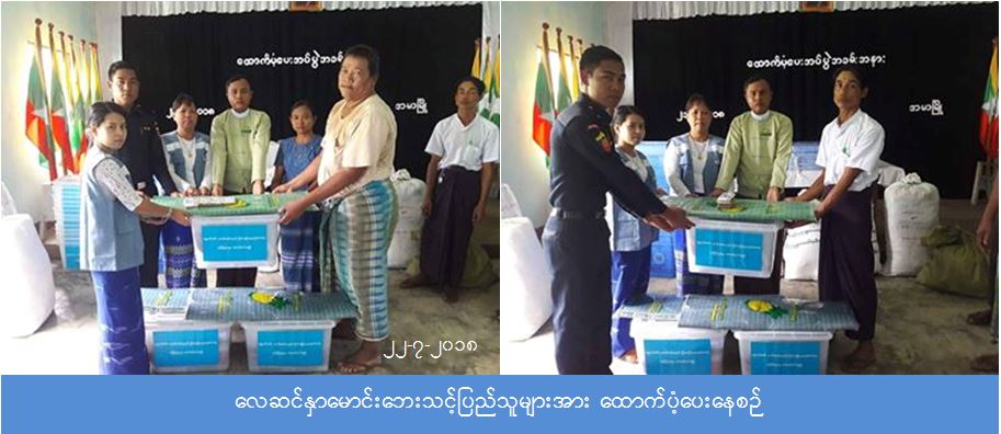 လူမှုဝန်ထမ်း၊ ကယ်ဆယ်ရေးနှင့် ပြန်လည်နေရာချထားရေးဝန်ကြီးဌာန၊ ဘေးအန္တရာယ်ဆိုင်ရာ စီမံခန့်ခွဲမှုဦးစီး ဌာန၊ ဖျာပုံခရိုင်ဦးစီးမှူးရုံးမှတာဝန်ရှိသူများသည် (၂၀-၇-၂၀၁၈)ရက်နေ့တွင် ဖျာပုံမြို့ နယ်၊ အမာမြို့ဘဝသစ် ကျေးရွာအုပ်စု၊ ခေတ္တာကျွန်းကျေးရွာ၌ လေဆင်နှာမောင်း တိုက်ခတ်မှုကြောင့် ပြိုကျပျက်စီးအိမ် (၁၈) လုံးနှင့် ယိုင်လဲပျက်စီးအိမ်(၇)လုံး၊ အိမ်ထောင်စု(၂၅) စုအတွက် အိမ်ဆောက် ပစ္စည်းဖိုးငွေ (၁,၉၄၀,၀၀၀) ကျပ်၊ လူဦးရေ(၁၁၄) ဦးအတွက် (၇) ရက်စာ ဆန်ဖိုးငွေ (၂,၃၉,၄၀၀) ကျပ်၊ ပြိုလဲနေအိမ်ရှိ အိမ်ထောင်စု(၁) စုအတွက် ကယ်ဆယ်ရေးပစ္စည်း (၁၆) မျိုး (၁၈) အိမ်ထောင်စုစာ၊ ယိုင်နဲ့အိမ်ထောင်စု(၇) စုအတွက်(၁၀) မျိုး (၇) အိမ်ထောင်စုစာကို လည်းကောင်း၊ အမာမြို့၊ အမှတ် (၁) ရပ်ကွက်တွင်လည်း အဆိုပါလေဆင်နှာမောင်း ဘေးကြောင့် နေအိမ်(၃) လုံးပြိုလဲပျက်စီးခဲ့ပြီး အိမ်ထောင်စု (၃) စုမှ လူဦးရေ (၁၂) ဦးလေဘေးသင့်ခဲ့ရာ အိမ်ဆောက်ပစ္စည်းဖိုးငွေ (၃၀၀,၀၀၀) ကျပ်၊ ဆန်(၇) ရက်စာဖိုးငွေ (၂၅,၂၀၀)ကျပ်၊ ကယ်ဆယ်ရေးပစ္စည်း(၁၇) မျိုးတို့ကို (၂၁-၇-၂၀၁၈) ရက်နေ့တွင် ဘေးသင့်ပြည်သူများအား အမာမြို့အုပ်ချုပ်ရေးမှူး၊ ဖျာပုံခရိုင်ဦးစီးမှူး (ဘစမ) တို့မှ အားပေးစကားနှစ်သိမ့်စကားများပြောကြားပြီး သွားရောက်ထောက်ပံ့ပေးအပ်ခဲ့ကြောင်း သိရှိရပါ သည်။