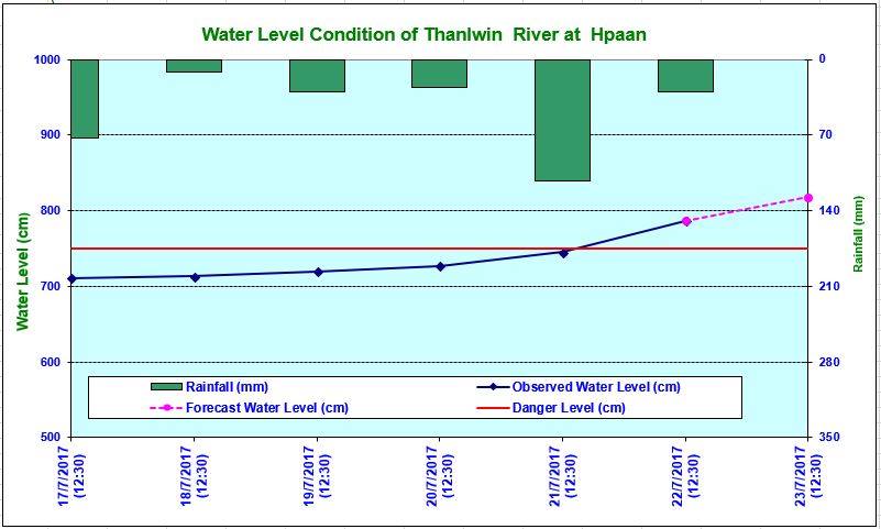 ယနေ့မြန်မာစံတော်ချိန် (၁၃:၃၀)နာရီအချိန် တိုင်းထွာချက်အရ သံလွင်မြစ်ရေသည် ဘားအံမြို့တွင် (၁) ပေခွဲခန့် ယင်းမြို့၏ စိုးရိမ်ရေမှတ်အထက်သို့ ကျော်လွန်နေပြီး နောက် (၁)ရက်အတွင်း (၁)ပေခွဲခန့် ဆက်လက်တက်လာနိုင်ကာ ယင်းမြို့၏ စိုးရိမ်ရေမှတ်အထက် ဆက်လက်တည်ရှိနိုင်ပါသည်။