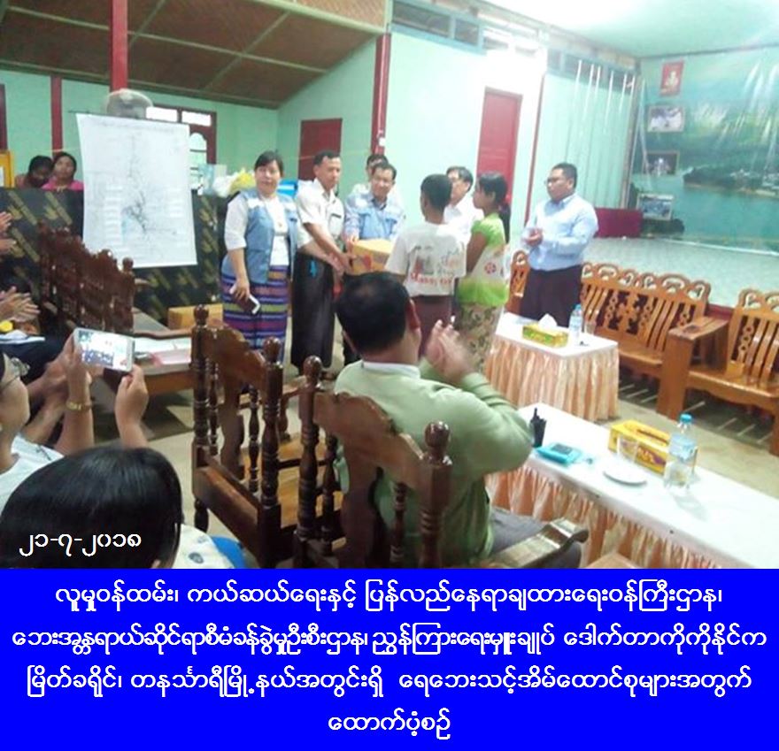 လူမှုဝန်ထမ်း၊ ကယ်ဆယ်ရေးနှင့် ပြန်လည်နေရာချထားရေးဝန်ကြီးဌာန၊ ဘေးအန္တရာယ်ဆိုင်ရာစီမံခန့်ခွဲမှုဦးစီးဌာန၊ ညွှန်ကြားရေးမှူးချုပ် ဒေါက်တာကိုကိုနိုင်၊ တနင်္သာရီတိုင်းဒေသကြီးဦးစီးမှူးရုံး (ဘစမ)မှ ညွှန်ကြားရေးမှူး ဒေါ်ဝင်းစန္ဒာကြည်နှင့် တာဝန်ရှိသူများသည် (၁၉-၇-၂၀၁၈) ရက်နေ့မှ (၂၁-၇-၂၀၁၈) ရက်နေ့အထိ တနင်္သာရီမြစ်ရေထပ်မံမြှင့်တက်မှုကြောင့် မြိတ်ခရိုင်၊ တနင်္သာရီမြို့နယ်အတွင်းရှိ ကျေးရွာများမှ ရေဘေးသင့်၍ ပြောင်းရွှေ့ခဲ့သည့်အိမ်ခြေ (၄၉၄) လုံး၊ အိမ်ထောင်စု (၄၉၅) စုမှ လူဦးရေ (၂၅၄၄) ဦးအတွက် ဆန်ဘိုး(၇)ရက်စာထောက်ပံ့ငွေစုစုပေါင်း (၅၃၄၂၄၀၀ိ/-)နှင့် ငါးသေတ္တာများအား အိမ်ထောင်စု(၁)စုလျှင် (၃)ဗူးနှုန်းဖြင့် စုစုပေါင်းငွေကျပ် (၈၉၆၀၀၀ိ/-) အား (၂၁-၇-၂၀၁၈) ရက်နေ့၊ ညနေ (၀၆း၀၀) နာရီအချိန်တွင် ရေဘေးသင့်ပြည်သူများအား ထောက်ပံ့ပေးအပ်ခြင်းအခမ်းအနားဖြင့် ထောက်ပံ့ပေးအပ်ရာ တနင်္သာရီတိုင်းဒေသကြီး လူမှုရေးနှင့်စည်ပင်သာယာရေးဝန်ကြီး ဦးဟိုပင်က အဖွင့်အမှာစကားပြောကြားခဲ့ကြောင်းနှင့် ကျန်ရှိသည့်ပြောင်းရွှေ့အိမ်ထောင်စုများမှ လူဦးရေများအတွက် ဆက်လက်ထောက်ပံ့ပေးသွားမည်ဖြစ်ကြောင်း သိရှိရပါသည်။