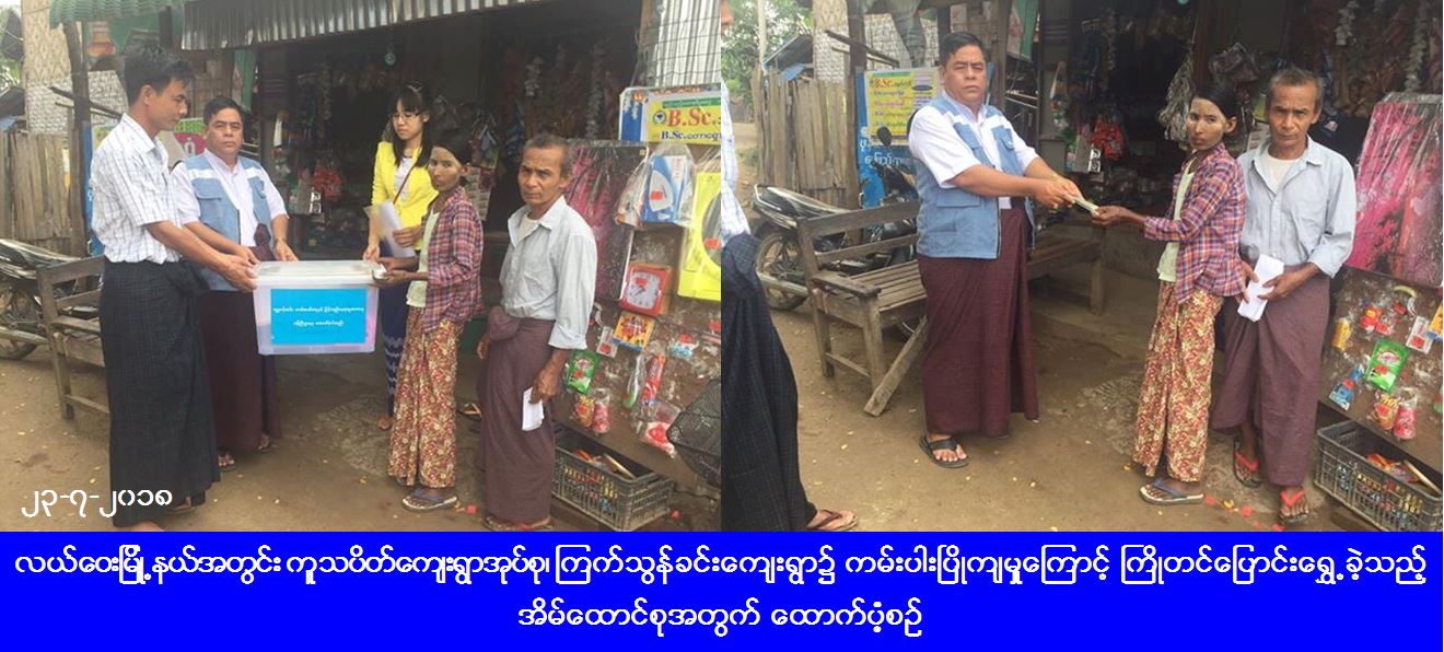 လူမှုဝန်ထမ်း၊ ကယ်ဆယ်ရေးနှင့် ပြန်လည်နေရာချထားရေးဝန်ကြီးဌာန၊ ဘေးအန္တရာယ်ဆိုင်ရာစီမံခန့်ခွဲမှုဦးစီးဌာန၊ ပြည်ထောင်စုနယ်မြေ၊ နေပြည်တော်၊ တိုင်းဦးစီးမှူးရုံးမှ တာဝန်ရှိသူများသည် လယ်ဝေးမြို့နယ်အတွင်း (၂၀-၇-၂၀၁၈) ရက်နေ့၊ (၁၆း၃၀) နာရီအချိန်တွင် တောင်ကျရေများပြီး ပတ္တာချောင်းရေမြင့်တက်တိုက်စားလာမှုကြောင့် ကူသပိတ်ကျေးရွာအုပ်စု၊ ကြက်သွန်ခင်းကျေးရွာ၌ ကမ်းပါးများ ပြိုကျမှုဖြစ်ပွားခဲ့ရာ လူနေအိမ်(၁)လုံး ကြိုတင်ပြောင်းရွှေ့ခြင်းအတွက် အိမ်ဆောက်ပစ္စည်းဖိုးငွေ(၅၀၀၀၀ိ/-)၊ လူဦးရေ(၄)ဦးအတွက် ဆန်ဖိုးငွေ(၈၄၀၀ိ/-)၊ စုစုပေါင်းရန်ပုံငွေ (၅၈၄၀၀ိ/-) နှင့် (၁၈၆၆၀ိ/-) တန်ဖိုးရှိ ကယ်ဆယ်ရေးပစ္စည်း (၁၁) မျိုး (၁)အိမ်ထောင်စာတို့အား (၂၃-၇-၂၀၁၈) ရက်နေ့၊ (၁၁း၃၀) နာရီအချိန်တွင် ပြည်သူများလက်ဝယ်သို့ သွားရောက်ထောက်ပံ့ခဲ့ဲကြောင်း သိရှိရပါသည်။