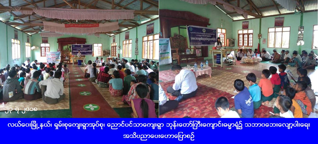 လူမှုဝန်ထမ်း၊ ကယ်ဆယ်ရေးနှင့် ပြန်လည်နေရာချထားရေးဝန်ကြီးဌာန၊ ဘေးအန္တရာယ်ဆိုင်ရာစီမံခန့်ခွဲမှုဦးစီးဌာန၊ ပြည်ထောင်စုနယ်မြေ၊ နေပြည်တော်၊ တိုင်းဦးစီးမှူးရုံးမှ တာဝန်ရှိသူများသည် (၂၃-၇-၂၀၁၈) ရက်နေ့ (၁၀း၀၀~၁၁း၃၀) နာရီအချိန်တွင် လယ်ဝေးမြို့နယ်၊ ရှမ်းစုကျေးရွာအုပ်စု၊ ညောင်ပင်သာကျေးရွာ ဘုန်းတော်ကြီးကျောင်းဓမ္မာရုံ၌ သဘာဝဘေးလျော့ပါးရေး အသိပညာပေးဟောပြောပွဲ ကျင်းပပြုလုပ်ခဲ့ပြီး တက်ရောက်လာသည့် ကျေးရွာသူ/ကျေးရွာသား (၁၃၀) ဦးအား လက်ကမ်းစာစောင်နှင့် ပိုစတာများ ဖြန့်ဝေပေးခဲ့ကြောင်း သိရှိရပါသည်။
