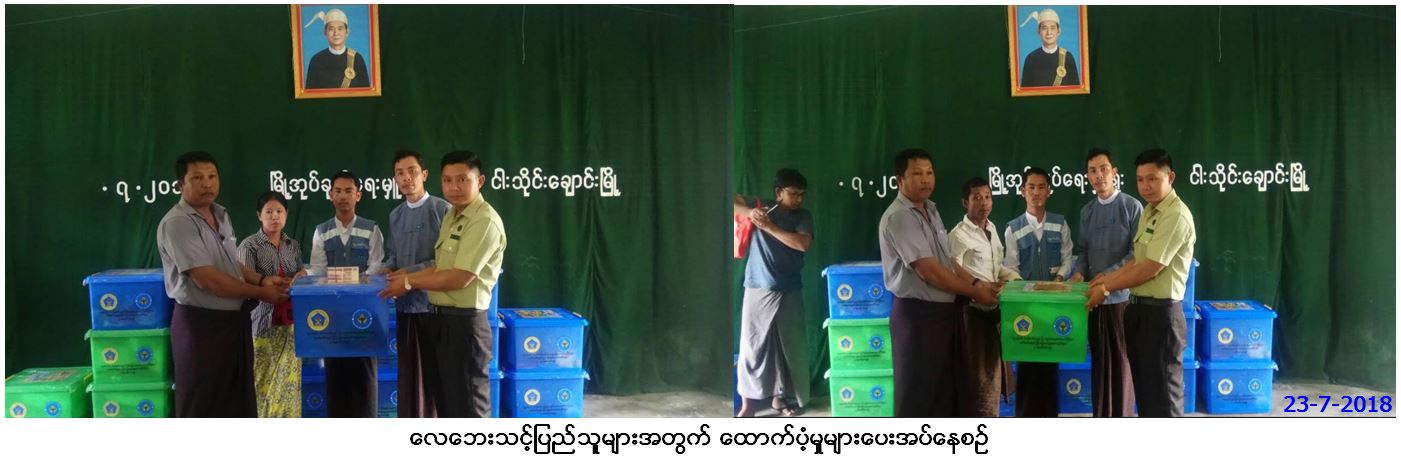 လူမှုဝန်ထမ်း၊ ကယ်ဆယ်ရေးနှင့်ပြန်လည်နေရာ ချထားရေးဝန်ကြီးဌာန၊ ဘေးအန္တရာယ်ဆိုင်ရာစီမံခန့့်ခွဲမှုဦးစီးဌာန၊ ဧရာဝတီတိုင်းဒေသကြီး ဦးစီးမှူးရုံးမှ တာဝန်ရှသူများသည် ဧရာဝတီတိုင်းဒေသကြီး၊ ပုသိမ်ခရိုင်၊ ရေကြည်မြို့နယ်၊ ငါးသိုင်းချောင်းမြို့၊ ရွှေဘိုရပ်ကွက်၊ ရှေ့ဆောင်ရပ်ကွက်၊ ဗောဓိကုန်းကျေးရွာနှင့် ဒေါင့်မှန်ကုန်းကျေးရွာတို့၌ (၁၆.၇.၂၀၁၈)ရက်နေ့တွင် ဖြစ်ပွားခဲ့သော လေဘေးကြောင့် ပြိုကျပျက်စီးနေအိမ် (၃)လုံး၊ အမိုးလန်ပျက်စီးနေအိမ် (၁၆) လုံး၊ အိမ်ထောင်စု (၁၉)စုမှ လူဦးရေ (၈၀)ဦး အတွက် ကယ်ဆယ်ရေးပစ္စည်း (၁၆)မျိုး (၃)ပုံး (၁၁၂,၀၅၉/-)ကျပ်၊ ပစ္စည်း၁၁မျိုး (၁၆)ပုံး (၂၉၆,၁၆၀/-)ကျပ်၊ အိမ်ဆောက်ပစ္စည်းဖိုး (၁,၁၀၀,၀၀၀/-)ကျပ်၊ ဆန်ရိက္ခာ(၇)ရက်စာ ရန်ပုံငွေ (၁၆၈,၀၀၀/-)ကျပ်၊ အမိုးလန် ဘုန်းတော်ကြီးကျောင်းဓမ္မာရုံအတွက် ကျောင်းဆောက်ပစ္စည်းဖိုး (၁၀၀,၀၀၀/-)၊ စုစုပေါင်းတန်ဖိုးငွေ (၁,၇၇၆,၂၁၉/-)ကျပ်တို့အား (၂၃.၇.၂၀၁၈)ရက်နေ့ (၁၃း၀၀)နာရီအချိန်တွင် ရေကြည်မြို့နယ်အုပ်ချုပ်ရေးမှူး၊ မြောင်းမြခရိုင်ဦးစီးမှူးရုံး(ဘစမ)မှ ခရိုင်ဦးစီးမှူး ဦးဝင်းဇော်ဌေးတို့နှင့်အတူ လေဘေးသင့်ပြည်သူများ လက်ဝယ်အရောက် ထောက်ပံ့ပေးအပ်ခဲ့ကြောင်း သတင်း ရရှိရပါသည်။