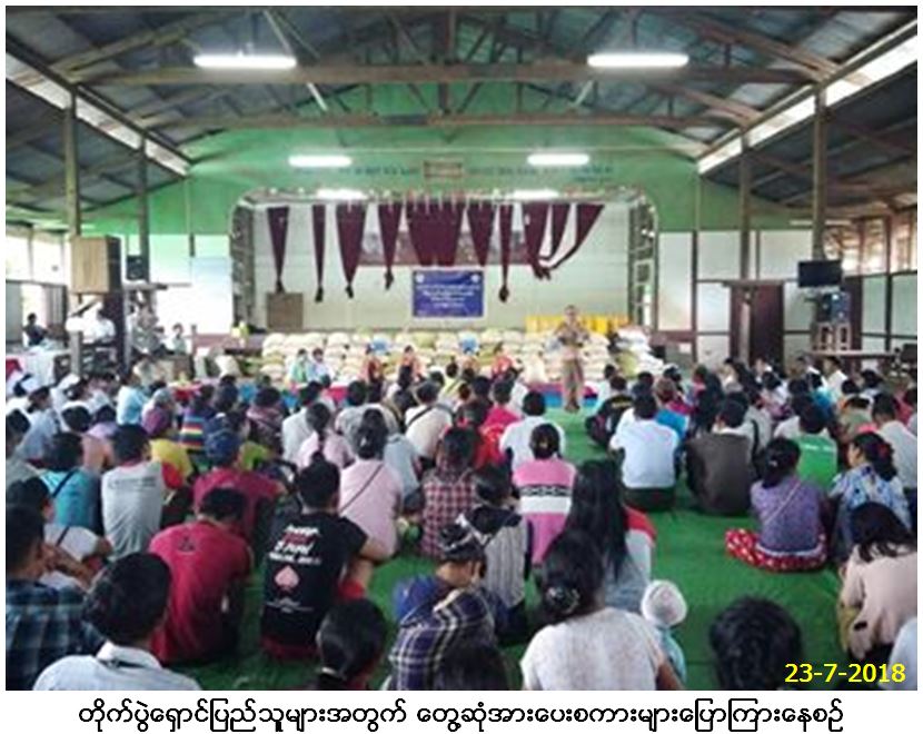 လူမှုဝန်ထမ်း၊ ကယ်ဆယ်ရေးနှင့်ပြန်လည်နေရာချထားရေးဝန်ကြီးဌာန၊ ဘေးအန္တရာယ်ဆိုင်ရာစီမံခန့့်ခွဲမှုဦးစီးဌာန၊ ကချင်ပြည်နယ်ဦးစီးမှူးရုံးမှ တာဝန်ရှိသူများသည် (၂၃-၇-၂၀၁၈)ရက်နေ့၌ ဖြစ်ပွားသည့် ကချင်ပြည်နယ်၊ မိုးကောင်းမြို့နယ်၊ နမ္မတီးမြို့၊ လမ်းခွကျေးရွာရှိ စခန်း(၄)ခုနှင့် ဖားကန့်မြို့နယ်၊ လဝါးကျေးရွာသို့ ပြောင်းရွှေ့ရောက်ရှိလာသော တိုက်ပွဲရှောင်ပြည်သူအိမ်ထောင်စု (၃၀၁)စု၊ လူဦးရေ(၁၃၅၃)ဦးတို့အတွက် ထောက်ပံ့ပစ္စည်းများပေးအပ်ရန် ကချင်ပြည်နယ်အစိုးရအဖွဲ့၊ လူမှုရေးဝန်ကြီး ဦးဆောင်သောဌာနဆိုင်ရာအဖွဲ့တို့နှင့်အတူ (၂၃.၇.၂၀၁၈)ရက်နေ့တွင် အဆိုပါ တိုက်ပွဲရှောင်ပြည်သူများအား တွေ့ဆုံအားပေး၍ တန်ဖိုးငွေကျပ် (၁၆,၇၄၇,၈၇၅/-)ရှိ ဆန်၊ဆီ၊ဆား၊ ပဲ (၁)လစာအား ထောက်ပံ့ပေးအပ်ခဲ့ကြောင်း သတင်းရရှိပါသည်။