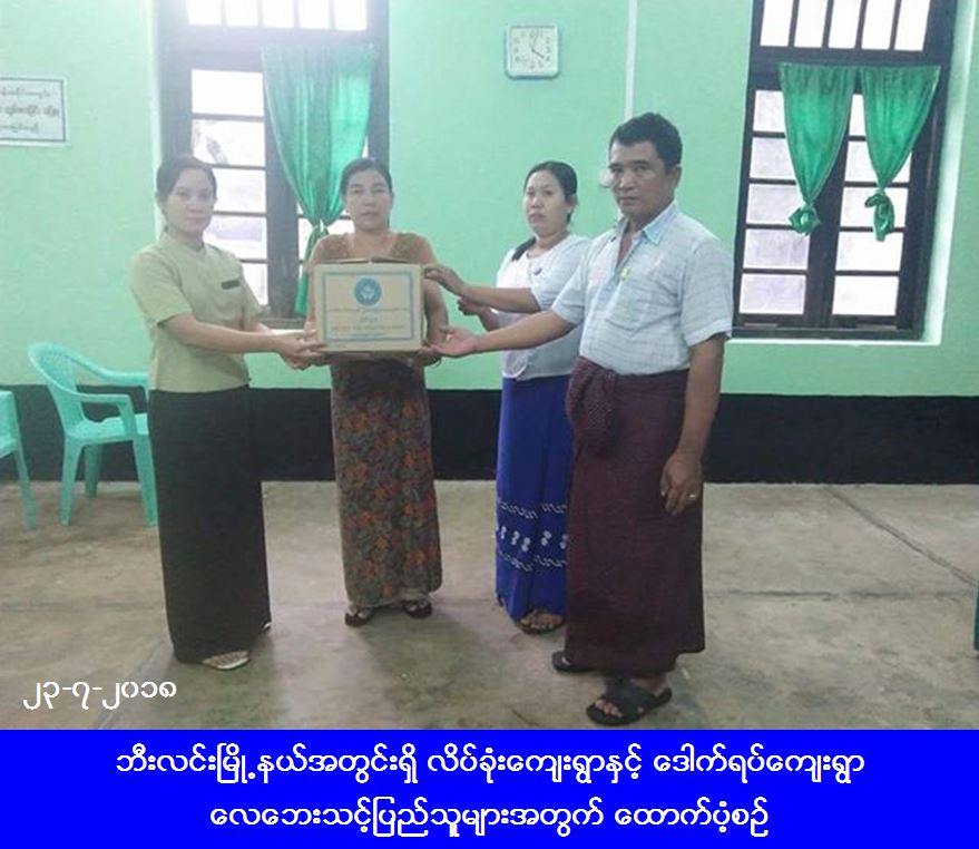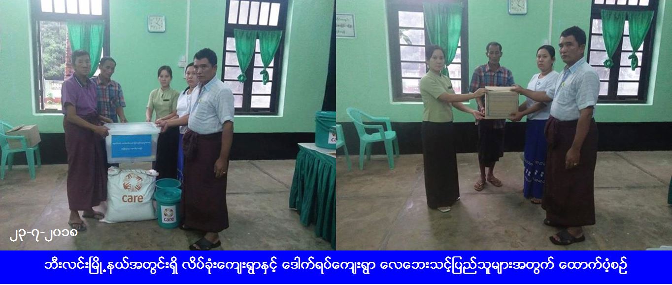 လူမှုဝန်ထမ်း၊ ကယ်ဆယ်ရေးနှင့် ပြန်လည်နေရာချထားရေးဝန်ကြီးဌာန၊ ဘေးအန္တရာယ်ဆိုင်ရာစီမံခန့်ခွဲမှုဦးစီးဌာန၊ ဘီးလင်းမြို့နယ်ဦးစီးမှူးရုံးမှ တာဝန်ရှိသူများသည် ဘီးလင်းမြို့နယ်အတွင်းရှိ လိပ်ခုံးကျေးရွာနှင့် ဒေါက်ရပ်ကျေးရွာတို့၌ (၂၂-၇-၂၀၁၈) ရက်နေ့၊ (၁၆း၀၀) နာရီအချိန်ခန့်တွင် မိုးသည်းထန်စွာ ရွာသွန်းပြီး လေပြင်းတိုတ်ခတ်မှုကြောင့် ပြိုကျခဲ့သည့် လူနေအိမ် (၃) လုံးနှင့် တစ်စိတ်တစ်ပိုင်းပျက်စီးခဲ့သည့် လူနေအိမ် (၃) လုံး စုစုပေါင်းလူနေအိမ် (၆) လုံးအတွက် အိမ်ဆောက်ပစ္စည်းဖိုးငွေ (၆၁၅၀၀၀ိ/-)၊ လူဦးရေ (၁၃) ဦးအတွက် ဆန်(၇) ရက်စာဖိုးငွေ (၂၇၃၀၀ိ/-)၊ ထောက်ပံ့ငွေစုစုပေါင်း (၆၄၂၃၀၀ိ/-) တို့အားလည်းကောင်း၊ ပြိုကျအိမ်ထောင်စု (၃) စုအတွက် ကယ်ဆယ်ရေးပစ္စည်း(၁၅) မျိုး (၃) အိမ်ထောင်စာ Family kit (၃) ထုပ်၊ တစ်စိတ်တစ်ပိုင်းပျက်စီးခဲ့သည့် အိမ်ထောင်စု (၃) စုအတွက် ကယ်ဆယ်ရေးပစ္စည်း (၁၁) မျိုး (၃) အိမ်ထောင်စာနှင့် ရေပုံးအဖုံးပါ (၆) ပုံးတို့အားလည်းကောင်း ဘီးလင်းမြို့နယ်အစည်းဝေးခန်းမ၌ (၂၃-၇-၂၀၁၈) ရက်နေ့၊ (၁၆း၀၀) နာရီအချိန်တွင် ထောက်ပံ့ခဲ့ကြောင်း သိရှိရပါသည်။