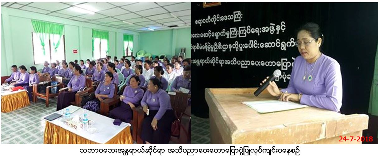 လူမှုဝန်ထမ်း၊ ကယ်ဆယ်ရေးနှင့်ပြန်လည်နေရာချထားရေးဝန်ကြီးဌာန၊ ဘေးအန္တရာယ်ဆိုင်ရာစီမံခန့်ခွဲမှုဦးစီးဌာန၊ ဖျာပုံခရိုင်ဦးစီးမှူးရုံးမှ တာဝန်ရှိသူများသည် မိခင်နှင့် ကလေးစောင့်ရှောက်မှုကြီးကြပ်ရေးအဖွဲ့တို့နှင့်ပူးပေါင်း၍ ဖျာပုံမြို့နယ်၊ အထွေထွေအုပ်ချုပ်ရေးဦးစီးဌာန အစည်းအဝေးခန်းမ၌ (၂၄-၇-၂၀၁၈)ရက်နေ့၊ နံနက် (ဝ၉း၃၀)နာရီမှ (၁၆း၃၀)နာရီအထိ ဧရာဝတီတိုင်းဒေသကြီး၊ ဖျာပုံခရိုင်၊ မအူပင်ခရိုင်ရှိ မိခင်နှင့် ကလေးစောင့်ရှောက်မှုကြီးကြပ်ရေးအဖွဲ့ဝင် သင်တန်းသား(၄၀)ဦးအား သဘာဝဘေးအန္တရာယ်ဆိုင်ရာ အသိပညာပေးဟောပြောပွဲ ဆွေးနွေးခဲ့ပြီး အသိပညာများဖြန့်ဝေပေးခဲ့ကြောင်း သတင်းရရှိပါသည်။