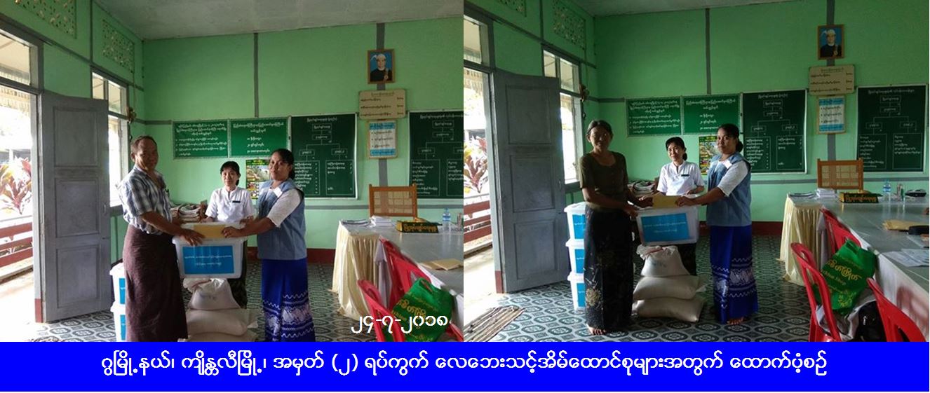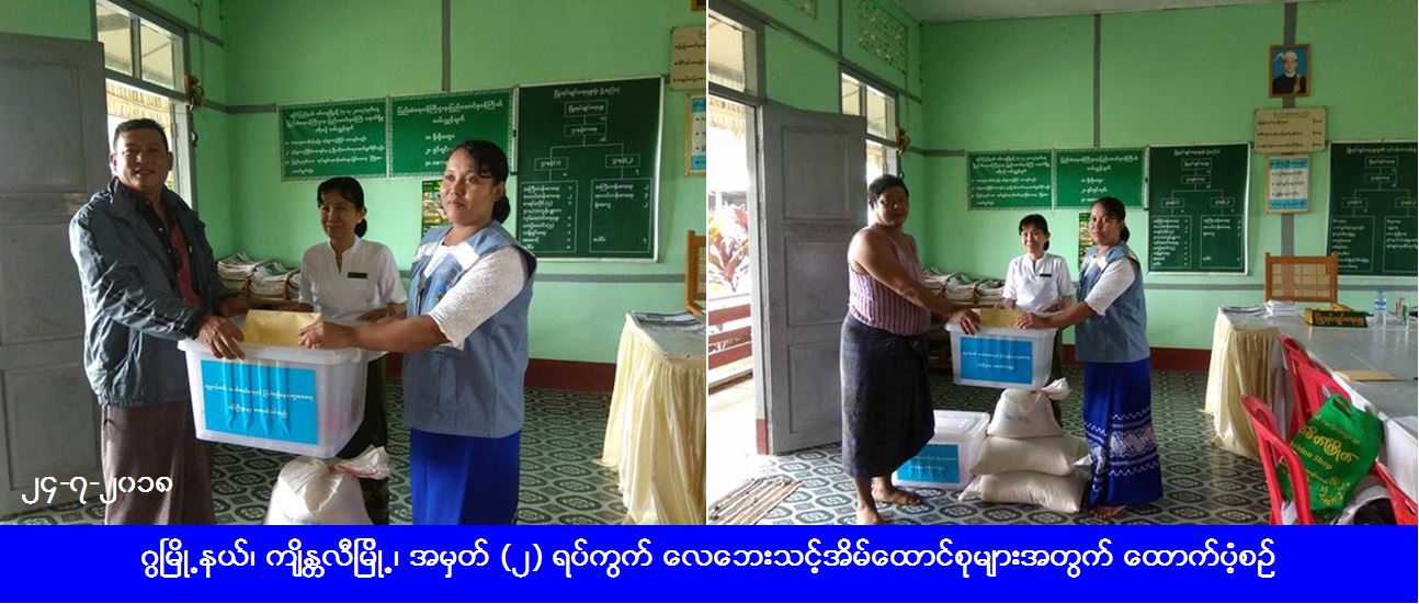 လူမှုဝန်ထမ်း၊ ကယ်ဆယ်ရေးနှင့် ပြန်လည်နေရာချထားရေးဝန်ကြီးဌာန၊ ဘေးအန္တရာယ်ဆိုင်ရာစီမံခန့်ခွဲမှုဦးစီးဌာန၊ ကျောက်ဖြူခရိုင်ဦးစီးမှူးရုံးမှ တာဝန်ရှိသူများသည် ဂွမြို့နယ်၊ ကျိန္တလီမြို့၊ အမှတ် (၂) ရပ်ကွက်၌ (၂၂-၇-၂၀၁၈) ရက်နေ့တွင် လေပြင်းတိုက်ခတ်မှုကြောင့် တစ်စိတ်တစ်ပိုင်းပျက်စီးခဲ့သည့် ဓနိမိုးထရံကာအိမ်(၁)လုံး နှင့် ဓနိမိုး၊ ပျဉ်ကာ(၃)လုံး စုစုပေါင်းအိမ်ခြေ (၄) လုံး၊ အိမ်ထောင်စု (၄) စုမှ ဘေးသင့်လူဦးရေ (၁၇) ဦးအတွက် ဆန်ရိက္ခာ(၇)ရက်စာ (၂၉) ပြည် (၆) ဗူး တန်ဖိုး(၂၉၇၅၀ိ/-)၊ အိမ်ဆောက်ပစ္စည်းဖိုးငွေ (၃၈၀၀၀၀ိ/-) နှင့် ကယ်ဆယ်ရေးပစ္စည်း(၁၀)မျိုး အိမ်ထောင်စု(၄)စုစာအား (၂၄-၇-၂၀၁၈) ရက်နေ့တွင် ကျိန္တလီမြို့အုပ်ချုပ်ရေးမှူးရုံး၌ ကျိန္တလီမြို့နယ်အထွေထွေအုပ်ချုပ်ရေးမှတာဝန်ရှိသူများ၊ အမှတ်(၂) ရပ်ကွက်အုပ်ချုပ်ရေးမှူးတို့နှင့်အတူူ ဘေးသင့်ပြည်သူများလက်ဝယ်သို့ သွားရောက်ထောက်ပံ့ခဲ့ကြောင်း သိရှိရပါသည်။