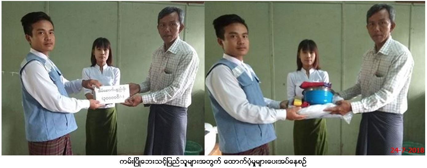 လူမှုဝန်ထမ်း၊ ကယ်ဆယ်ရေးနှင့် ပြန်လည်နေရာချထားရေးဝန်ကြီးဌာန၊ ဘေးအန္တရာယ်ဆိုင်ရာစီမံခန့်ခွဲမှုဦးစီးဌာန၊ မကွေးတိုင်းဒေသကြီး၊ ပခုက္ကူခရိုင်၊ ရေစကြိုမြို့နယ်ဦးစီးမှူးရုံးမှ တာဝန်ရှိသူများသည် ရေစကြိုမြို့နယ်၊ ညောင်ဇောက်ကျေးရွာအုပ်စု၊ ကျောမကြားကျးရွာနှင့် အောင်ပန်းချောင်းကျေးရွာအုပ်စု၊ အောင်ပန်းချောင်းကျေးရွာတို့တွင် (၂၄.၇.၂၀၁၈)ရက်နေ့ (၁၁း၁၅)နာရီအချိန်၌ ချင်းတွင်းမြစ်ရေတိုက်စား၍ကမ်း ပါးပြိုကျမှုကြောင့် ကြိုတင်ဖျက်သိမ်းပြောင်းရွှေ့မှုများ ဆောင်ရွက်ခဲ့ကြရာ ကြိုတင်ဖျက်သိမ်းပြောင်းရွှေ့လူနေအိမ်(၃)လုံး၊ အိမ်ထောင်စု(၃)စု၊ လူဦးရေ(၁၉)ဦးတို့အတွက် ကယ်ဆယ်ရေးပစ္စည်း(၉)မျိုး၊ ဆန်ရိက္ခာဖိုး(၇)ရက်စာ(၃၉၉၀၀ိ/-)၊ အိမ်ဆောက်ပစ္စည်းဖိုး(၃၀၀၀၀၀ိ/-)စုစုပေါင်း (၃၃၉၉၀၀ိ/-)ကျပ်တို့အား (၂၄.၇.၂၀၁၈)ရက်နေ့၊ ရေစကြိုမြို့နယ်အထွေထွေအုပ်ချုပ်ရေးဦးစီးဌာနရုံး၌ မြို့နယ်အထွေထွေအုပ်ချုပ်ရေးရုံးမှ တာဝန်ရှိသူများနှင့်အတူ သက်ဆိုင်ရာကျေးရွာအုပ်ချုပ်ရေးမှူးများ လက်ဝယ်အရောက် ထောက်ပံ့ပေးအပ်ခဲ့ကြောင်း သတင်းရရှိပါသည်။