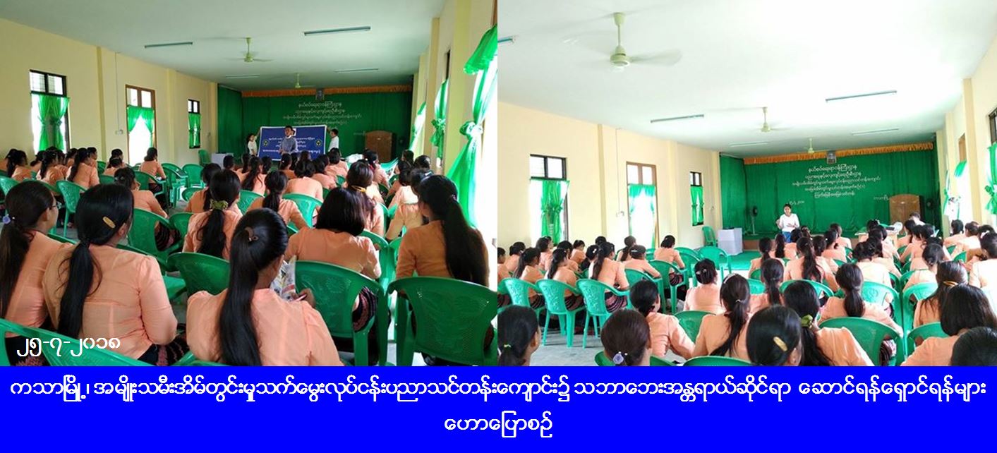 လူမှုဝန်ထမ်း၊ ကယ်ဆယ်ရေးနှင့် ပြန်လည်နေရာချထားရေးဝန်ကြီးဌာန၊ ဘေးအန္တရာယ်ဆိုင်ရာစီမံခန့်ခွဲမှုဦးစီးဌာန၊ ကသာခရိုင်ဦးစီးမှူးရုံးမှ တာဝန်ရှိသူများသည် (၂၅-၇-၂၀၁၈) ရက်နေ့တွင် ကသာမြို့၊ အမျိုးသမီးအိမ်တွင်းမှုသက်မွေးလုပ်ငန်းပညာသင်တန်းကျောင်း၌ သင်တန်းသူ(၇၅)ဦးခန့်ကို သဘာဘေးအန္တရာယ်ဆိုင်ရာ ဆောင်ရန်ရှောင်ရန်များ ဟောပြောဆွေးနွေးခဲ့ပြီး လက်ကမ်းစာစောင်များ ဖြန့်ဝေပေးခဲ့ကြောင်း သိရှိရပါသည်။